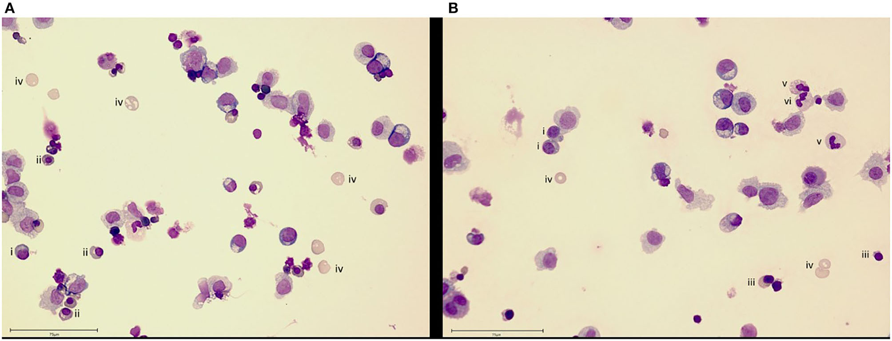 Bone marrow cell maintenance and differentiation in an MPS. Culture of human CD34+ cells on a human mesenchymal stem cell-seeded scaffold in the recirculating HUMIMIC Chip2 for (A) 17 or (B) 24 days shows differentiation into erythroid (day 17) and then, additionally, neutrophil (day 24) lineage cells. Cells are identified as (i) basophilic normoblast, (ii) polychromatic normoblast, (iii) orthochromatic normoblast, (iv) reticulocyte, (v) band cell and (vi) neutrophil. Scale bar−75 μm.