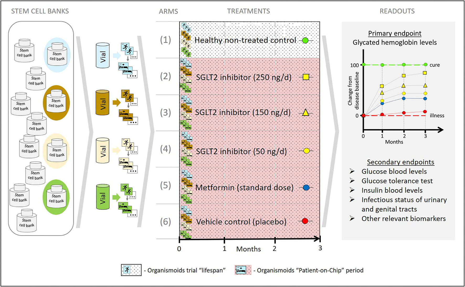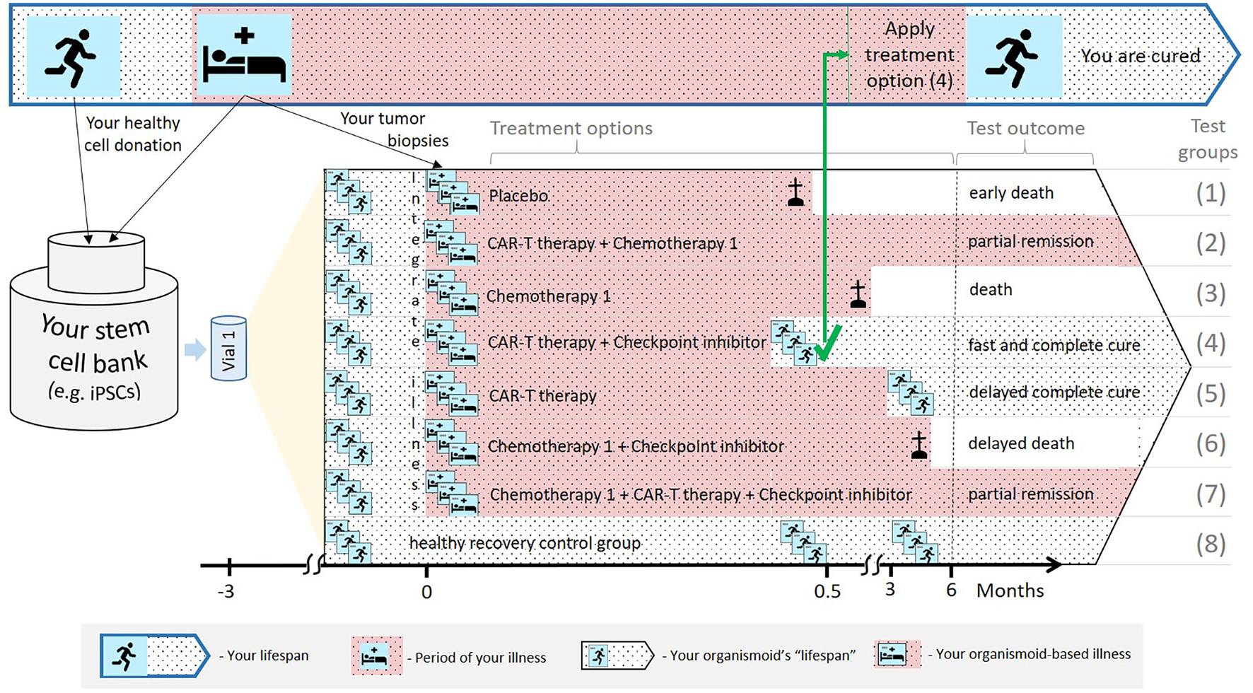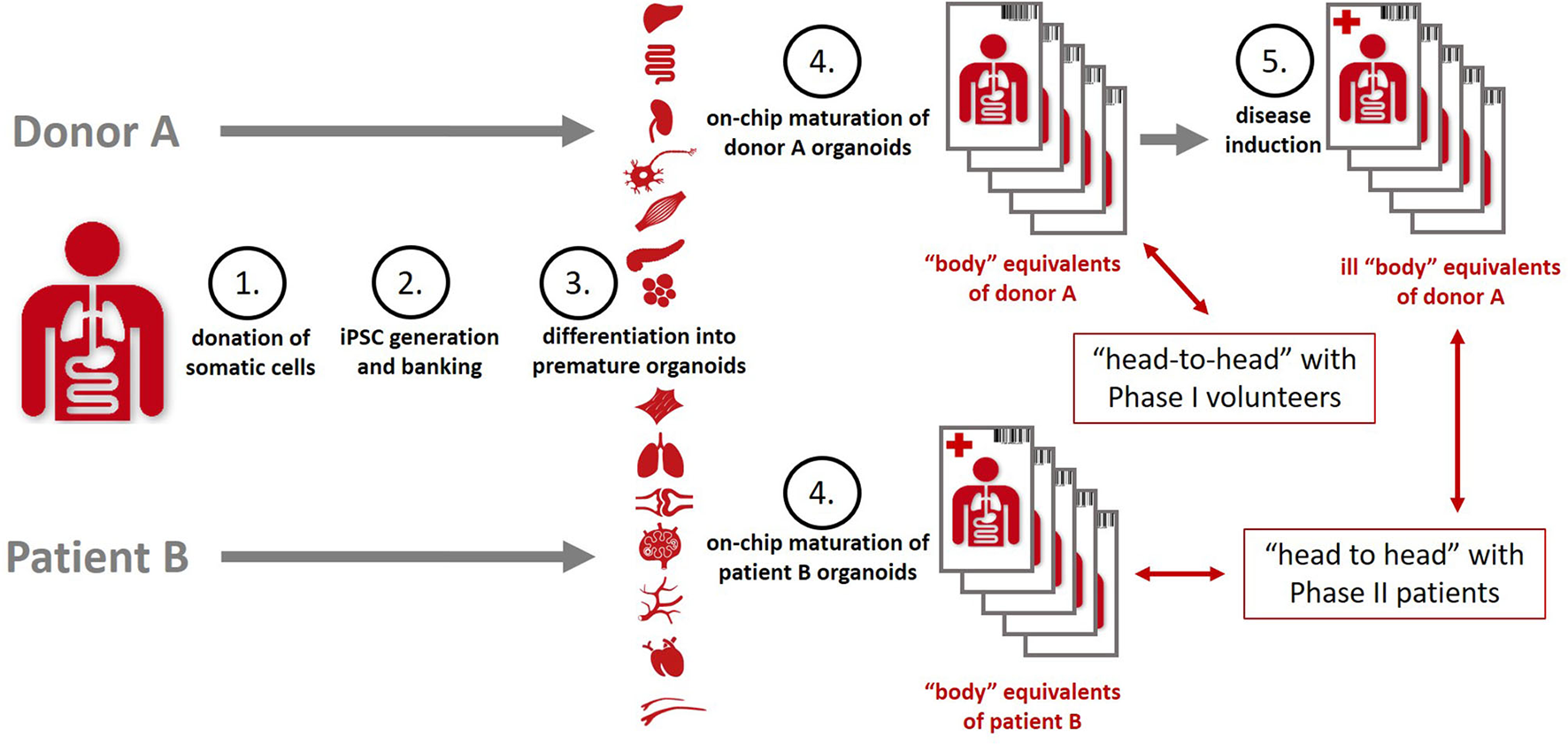 Subsequently, the concept of emulating the process of disease and healing of an individual patient using his/her organismoids on chips follows the principles of (i) induction of a disease in organismoids by natural disease processes or the transmission of pathogens or diseased tissues derived from the patient; (ii) the mimicry of a human clinical trial with a large number of patients by a trial with the equivalent number of healthy and diseased organismoids of one single patient; and (iii) the precise selection of the right medicine or therapy and the most efficacious exposure regime for each individual patient.