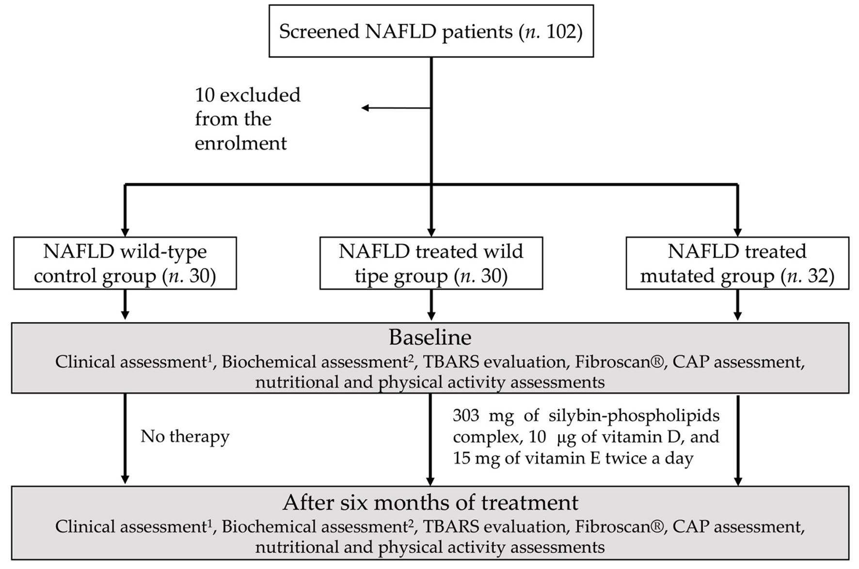 On the basis of the abovementioned evidence, the aim of this study is to evaluate the effect of PNPLA3 rs738409, TM6SF2 rs58542926, and MBOAT7 rs641738 on 303 mg of silybin-phospholipids complex, 10 μg of vitamin D, and 15 mg of vitamin E twice a day for 6 months administration in NAFLD patients.