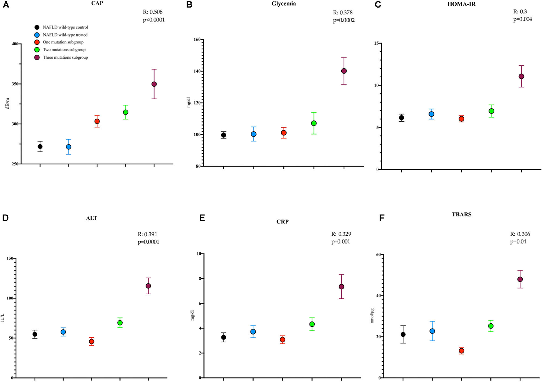 Mean with SEM values of some study parameters showing, at the linear regression model applied, a direct worsening relationship with the number of mutations at baseline. (A) Controlled attenuation parameter (CAP) (NAFLD wild type control: T0: 271.9 ± 6.5; NAFLD wild type treated: T0: 271.5 ± 9.4; one mutation subgroup: T0: 303.3 ± 7.3; two mutations subgroup: T0: 314.7 ± 8.7; three mutations subgroup: T0: 349.8 ± 18.5 dB/m). (B) Glycemia (NAFLD wild type control: T0: 99.7 ± 2.1; NAFLD wild type treated: T0: 100.3 ± 4.5; one mutation subgroup: T0: 101.2 ± 3.4; two mutations subgroup: T0: 107.2 ± 6.8; three mutations subgroup: T0: 140.2 ± 8.5, mg/dl). (C) The homeostatic model assessment for insulin resistance (HOMA-IR) (NAFLD wild type control: T0: 6.15 ± 0.4; NAFLD wild-type treated: T0: 6.59 ± 0.59; one mutation subgroup: T0: 6.03 ± 0.37; two mutations subgroup: T0: 6.95 ± 0.73; three mutations subgroup: T0: 11.06 ± 1.28). (D) Alanine aminotransferase (ALT) (NAFLD wild-type control: T0: 54 ± 5.2; NAFLD wild-type treated: T0: 57 ± 5.1; one mutation subgroup: T0: 45 ± 5.1; two mutations subgroup: T0: 69 ± 6.1; three mutations subgroup: T0: 115 ± 10 IU/L). (E) C reactive protein (CRP) (NAFLD wild type control: T0: 3.26 ± 0.37; NAFLD wild type treated: T0: 3.72 ± 0.48; one mutation subgroup: T0: 3.08 ± 0.32; two mutations subgroup: T0: 4.32 ± 0.59; three mutations subgroup: T0: 7.34 ± 0.97 mg/dl). (F) The thiobarbituric acid reactive substance (TBARS) (NAFLD wild-type control: T0: 21.12 ± 4.26; NAFLD wild-type treated: T0: 22.75 ± 4.73; one mutation subgroup: T0: 13.21 ± 1.61; two mutations subgroup: T0: 25.25 ± 2.76; three mutations subgroup: T0: 47.97 ± 4.29 nmol/μg).