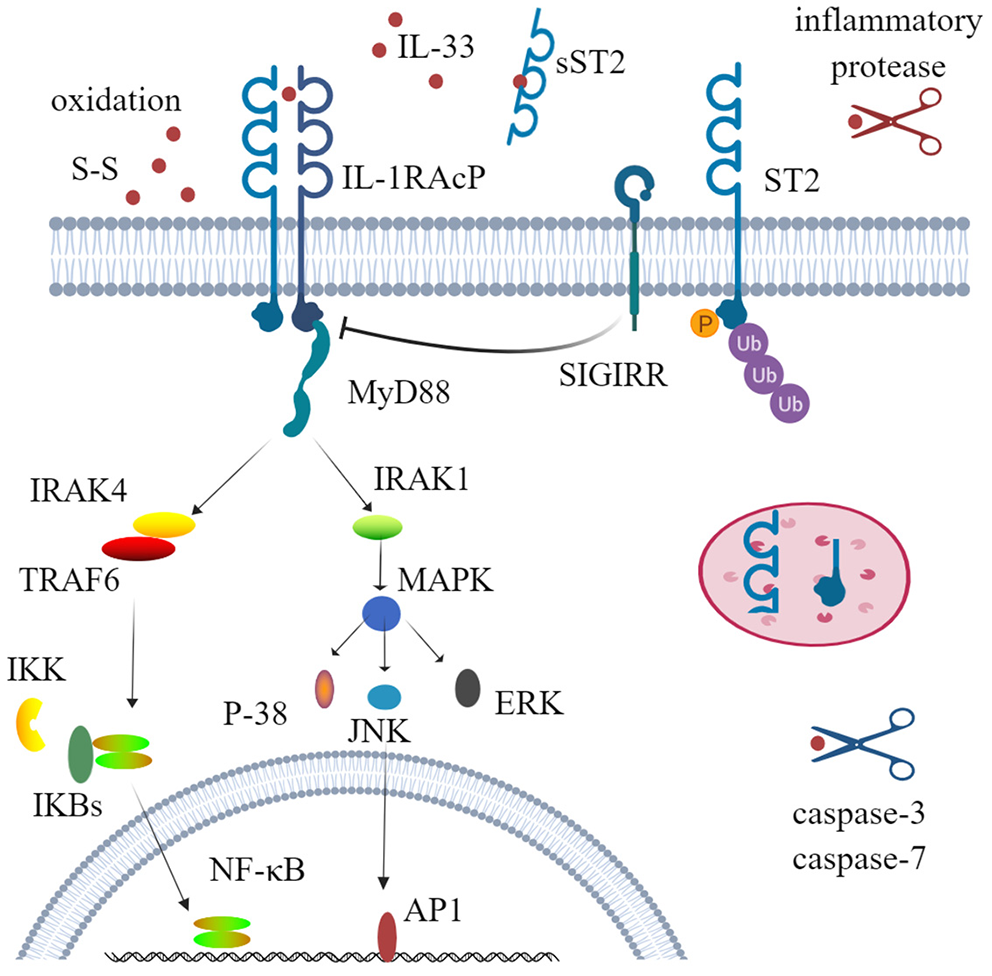 The receptor ST2, also known as DER4, Fit-1, or T1, is one of the co-receptors of IL-33 and is mainly encoded by the IL-1RL1 gene. Before the discovery of IL-33, ST2 was considered as an orphan receptor, and now IL-33 is still the only ligand of ST2 (36, 37). Three isoforms of ST2 have been identified in humans, all of which are produced by alternative splicing: transmembrane receptor type (ST2L), soluble form (sST2), and variant ST2 (ST2V) (38–40). The soluble form acts as a decoy receptor to antagonize IL-33. When IL-33 binds to the transmembrane ST2 receptor, the membrane-anchored ST2 will recruit IL-1 receptor accessory protein (IL-1RAcP) to form a dimer, resulting in the dimerization of its intracellular domain. The adaptor protein myeloid differentiation protein 88 (MyD88) is recruited through the dimerization of Toll/IL-1 receptor (TIR) to activate downstream kinases. IL-1R-associated kinase 1 (IRAK1) and IL-1R-associated kinase 1 (IRAK4) and TNF receptor-associated factor 6 (TRAF6) are then activated, which ultimately leads to the activation of mitogen-activated protein kinases (MAPKs) and NF-κB transcription factor (41–44). This signal pathway is very similar to that of IL-1β and IL-18. Unlike IL-1RAcP, IL-33 stimulation induces a binding of ST2 with single immunoglobulin domain IL-1R-related molecule (SIGIRR) to form a complex, which can inhibit the formation of intracellular dimers and activate the ubiquitin–proteasome system (45) (Figure 1).