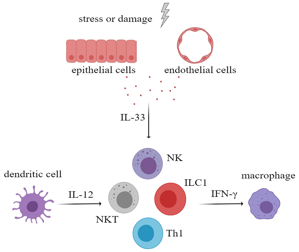 Figure 3. After activation of innate immune cells, especially myeloid dendritic cells, large amounts of interleukin-12 (IL-12) were secreted. IL-33 and IL-12 had a synergistic effect in stimulating NK cells, NKT cells, ILC1, and Th1 to secrete more IFN-γ, which will aggravate tissue damage. NK cells, natural killer cells; NKT cell, natural killer T cell; ILC, innate lymphoid cell.