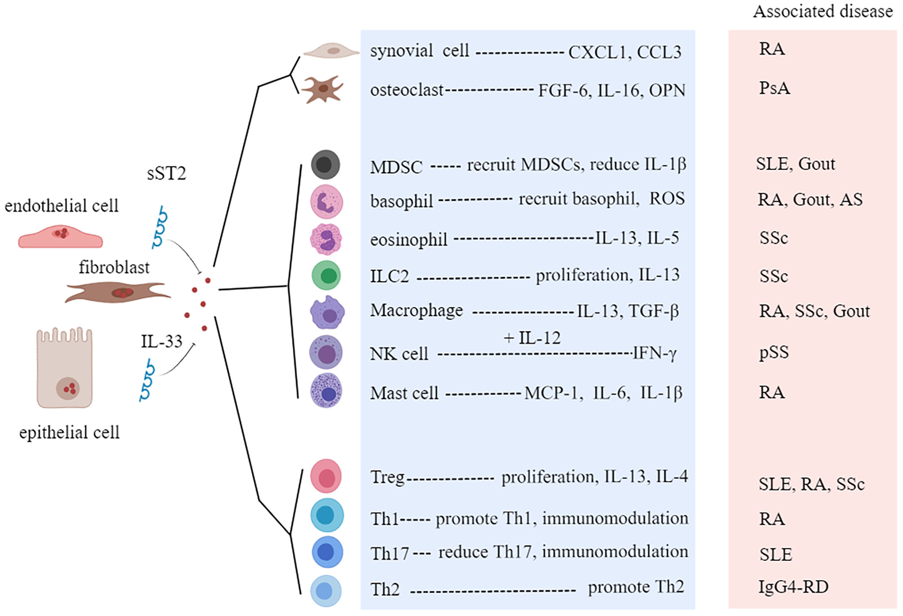 In summary, the sources and targets of IL-33 involve a variety of cell types. Although great advances have been made in recent years, more evidence is needed to clarify the exact role of the IL-33/ST2 axis in rheumatic diseases.