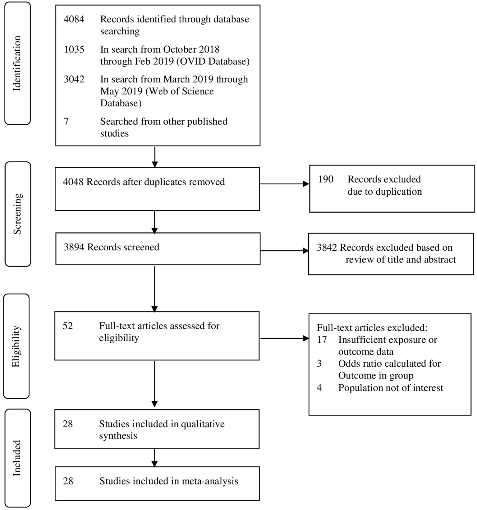 From the initial 4,084 records, 52 articles qualified for full-text review, of which 28 were included in systematic review and meta-analysis (Figure 1). Overall, 11 prospective studies, 14 retrospective studies, one RCT, one cross-sectional, and one case-control study were included. The studies were published between 2008 and 2018 with retrospective cohorts starting from 1975. Studies reported data from six different continents. Four studies were from America (three from US and one from Canada), five studies from Australia, nine studies from Europe, seven studies from Asia, and three studies from Africa. There was also one study that covered 29 countries in Africa, Asia, Latin America, and the Middle East. Sample sizes ranged from 22 to 6,85,137 women, involving 1,524,695 women who underwent CS in the previous pregnancy (Table 1).