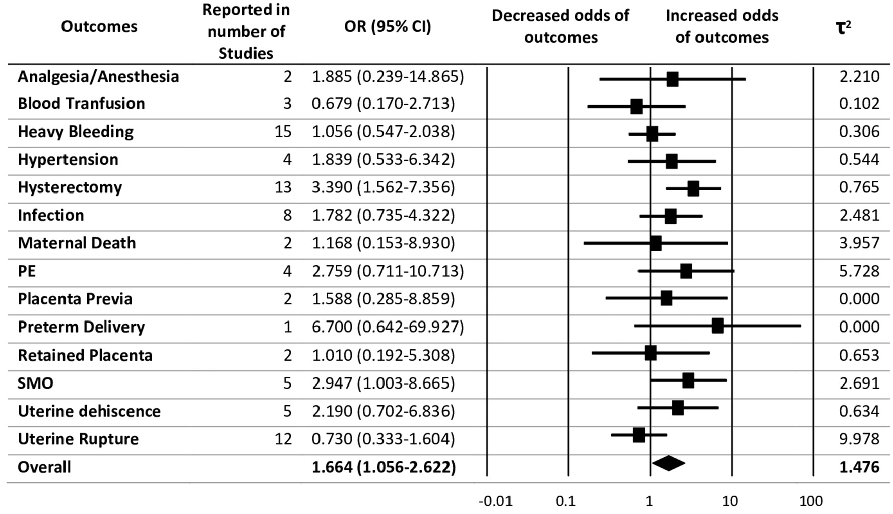 The pooled evidence for risk of adverse maternal outcomes with previous CS has been shown in Figure 2. Random-effects analysis showed an association between previous CS with adverse maternal outcomes with an overall pooled effect size of 1.66 (95% CI 1.06–2.62) and heterogeneity as τ2 = 1.48. Of the adverse maternal outcomes, hysterectomy was found to have the highest association with previous CS after preterm delivery with OR = 3.39 (95% CI 1.56–7.36), followed by severe maternal outcomes with OR = 2.95 (95% CI 1.00–8.67).