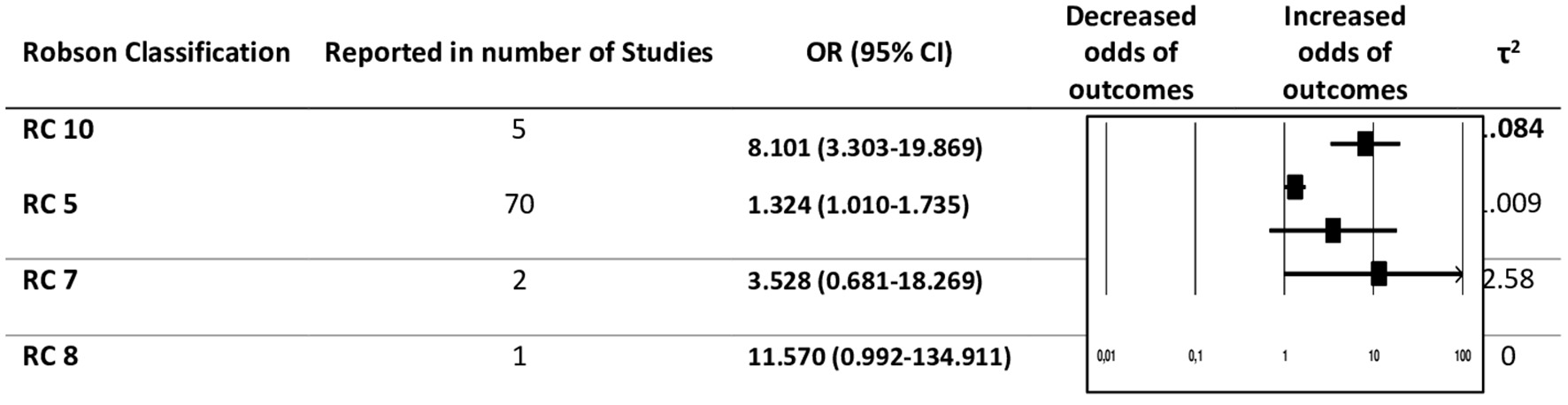 The studies which qualified for the final analysis reported women belonging to four groups of Robson Classification (RC5, RC7, RC8, and RC10). RC5 was the most commonly reported group in the selected studies. The outcomes reported in RC5 varied into 13 different maternal adverse outcomes. Despite being the most commonly reported class, the overall pooled effect of RC5 with adverse maternal outcomes was found to be 1.32 (95% CI 1.01–1.74) (Figure 3).