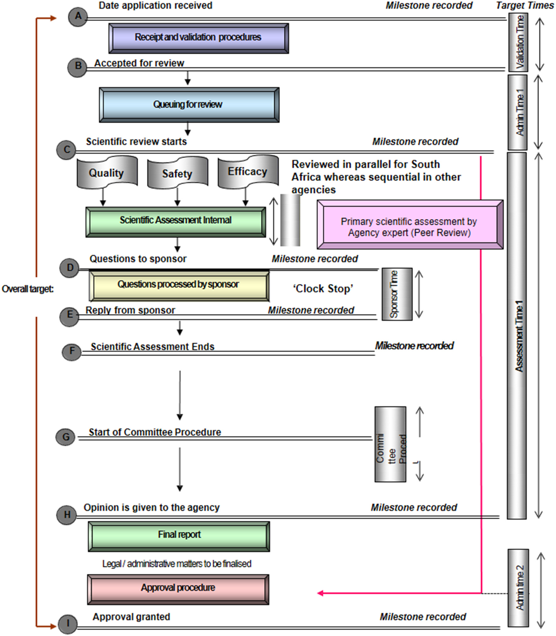 The results of this study can be used as a baseline going forward and presents an opportunity for agencies to re-examine their processes to determine areas of improvement, particularly where another agency with a comparable workload is able to achieve shorter registration times. Routine recording of the milestones studied here will enable the monitoring and measurement of key performance indicators such as timelines for validation, queue time, scientific assessment and the overall approval, will enable the rapid identification of areas requiring improvement and a proposal of gap-closing measures such as re-engineering of processes or the injection of additional resources by the agencies.