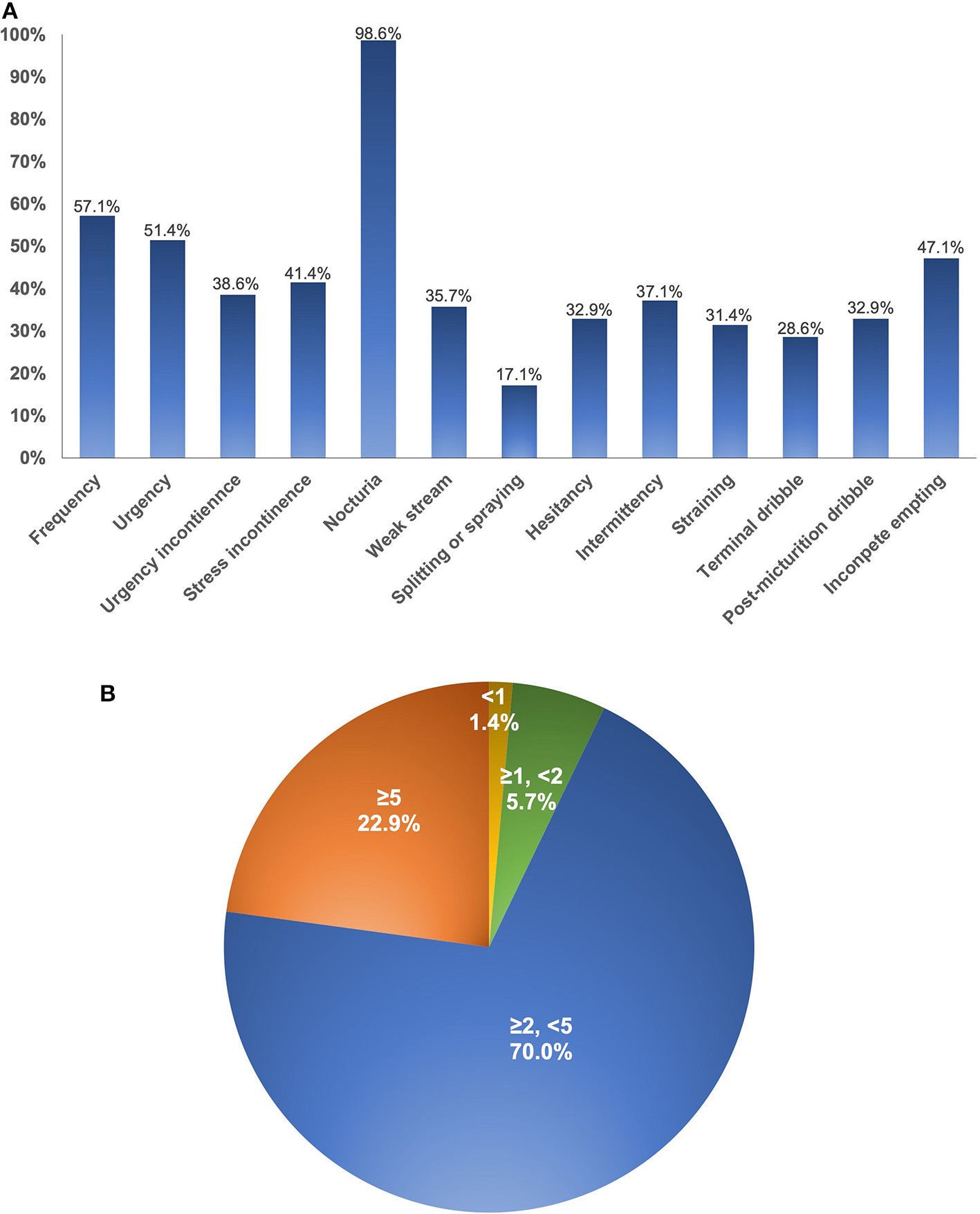 Nocturia (98.6%), frequency (57.1%), and urgency (51.4%) were the top three prevalent LUTS in this group of patients (Figure 1). Among them, as high as 72.9% suffered at least two wake-up voids per night. In addition, there was a relatively high incidence of overall daytime incontinence, such as stress (41.4%), urgency (38.6%), and mixed (15.7%) subtypes. In addition, painful voiding (10.0%), vulvodynia/vaginodynia (8.6%), and bladder region pain (7.1%) were reported by a small number of patients.