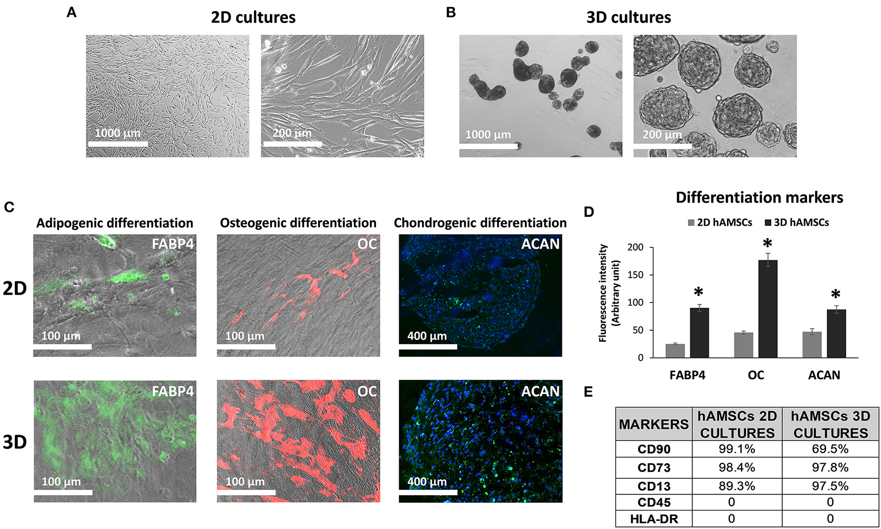 Figure 2. Human amnion-derived mesenchymal stem cells (hAMSCs) cultured as both monolayer and spheroids. (A) Representative DIC images of hAMSCs grown in monolayer (2D cultures). (B) Representative DIC images of hAMSCs grown as spheroids (3D cultures). (C) Immunofluorescence staining localization of fatty acid binding protein 4 (FABP4), Osteocalcin (OC), and Aggrecan (ACAN) in hAMSCs grown as both monolayer and spheroids. (D) Graphic depicts FABP4, OC, and ACAN fluorescence intensity in hAMSCs grown as both monolayer and spheroids. (E) Cytofluorimetric analysis of the surface marker in hAMSCs grown in 2D cultures and 3D cultures at passage 2. DIC, differential interference contrast. *p < 0.05 vs. 2D hAMSCs.