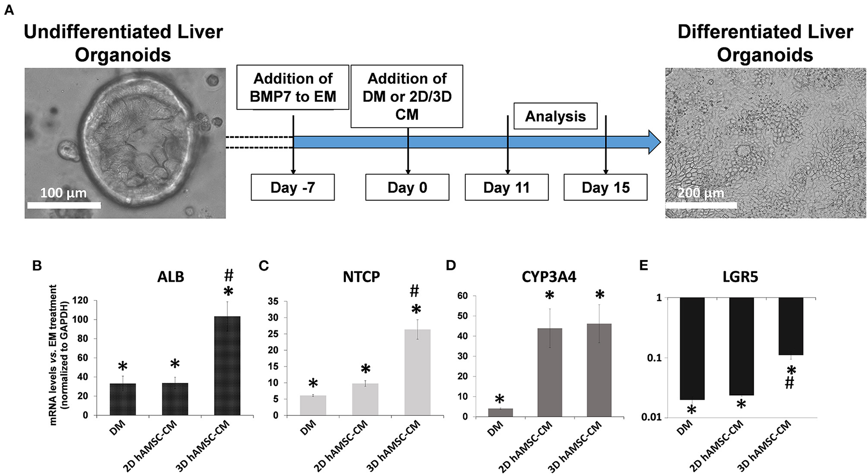 Figure 3. Differentiation of organoids. (A) Experimental design (with DIC images of undifferentiated and differentiated liver organoids) to study the potential effects of MSC-derived conditioned medium (CM). (B–E) Expression analysis of markers of hepatic differentiation (ALB, NTCP, and CYP3A4) and of the stem marker (LGR5) in liver organoids differentiated for 15 days in each condition. DM, differentiation medium; EM, expansion medium; 2D hAMSC-CM, DM conditioned for 3 days by hAMSCs grown in monolayer; 3D hAMSC-CM, DM conditioned for 3 days by hAMSCs grown as spheroids. Transcript levels were normalized to those of GAPDH and expressed as fold change (2−ΔΔCt) vs. EM. Data are means ± SD.; *p < 0.05 vs. EM; #p < 0.05 vs. 2D hAMSC-CM. DIC, differential interference contrast.