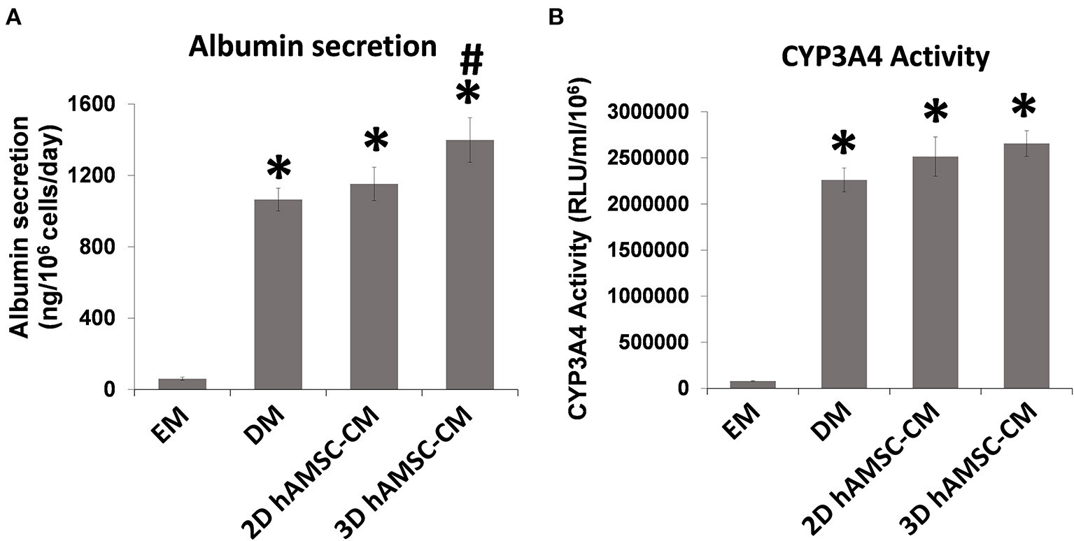 Figure 4. Analysis of (A) albumin secretion and (B) CYP3A4 activity in human liver organoids differentiated for 15 days in each condition. EM, expansion medium; DM, differentiation medium; 2D hAMSC-CM, DM conditioned for 3 days by hAMSCs grown in monolayer, 3D hAMSC-CM, DM conditioned for 3 days by hAMSCs grown as spheroids. Data are means ± SD. *p < 0.05 vs. EM. #p < 0.05 vs. 2D hAMSC-CM.