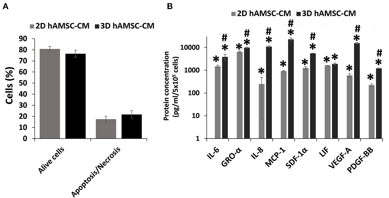 Figure 5. Viability and secretion of cytokines/chemokines and growth factors in monolayer (2D) and spheroids cultures (3D) of human amnion-derived mesenchymal stem cells (hAMSCs). (A) Quantification of both alive and necrotic/apoptotic cells in 2D and 3D cultures of hAMSCs. (B) The conditioned medium (CM) was collected for both 2D and 3D hAMSCs cultured in differentiation medium (DM) for 72 h and selected cytokines/chemokines and growth factors were analyzed. Data are means ± SD. *p < 0.05 vs. DM. #p < 0.05 vs. 2D hAMSC-CM.