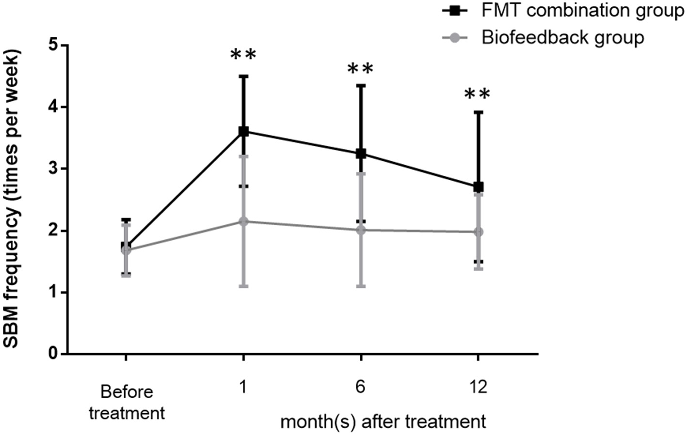 The mean values of SBMs frequency within one wk before treatment were 1.68 ± 0.41 and 1.74 ± 0.44 in the biofeedback group and the FMT combination group, respectively (p > 0.05). The frequency of SBMs (times per week) at one month after treatment were 2.15 ± 1.05 in the biofeedback group and 3.61 ± 0.89 in the FMT combination group, respectively, which were significantly different (p = 0.0031). Furthermore, the mean values of SBMs frequency at 6 and 12 months after treatment were 2.01 ± 0.91 and 1.98 ± 0.6 in the biofeedback group. In comparison, the frequency of SBMs 6 and 12 months after FMT combined with biofeedback was 3.25 ± 1.1 and 2.71 ± 1.21 times per week (p = 0.0024 and p = 0.0046, respectively, Figure 1). According to the exclusion criteria, the number of patients in the biofeedback group and the FMT combination group when 1/6/12 month(s) after the corresponding therapy were 37 and 38/32 and 36/16 and 25, respectively.
