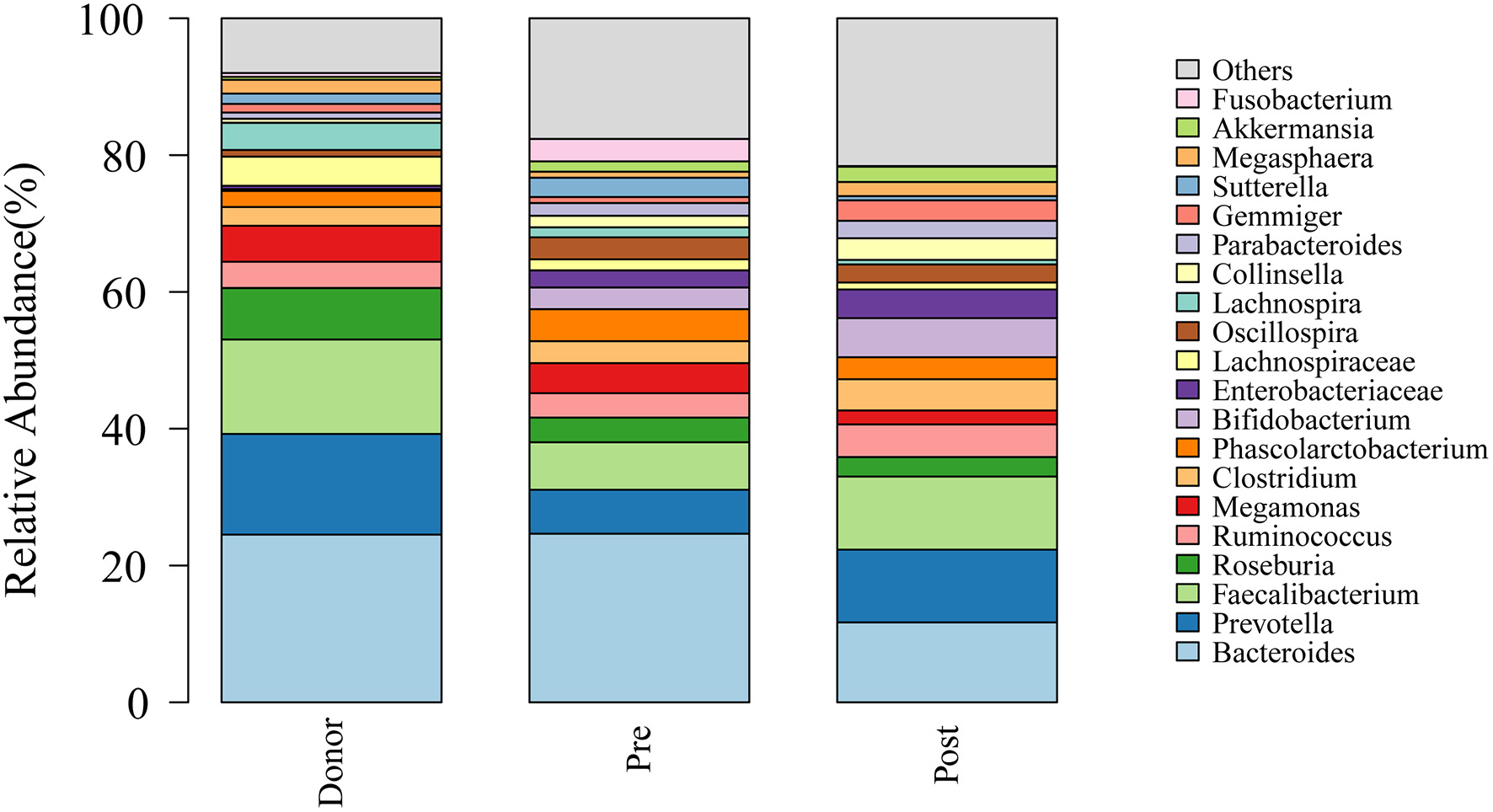 Genus distribution of the gut microbiomes of the donors, mixed constipated patients before and after receiving FMT combination therapy.