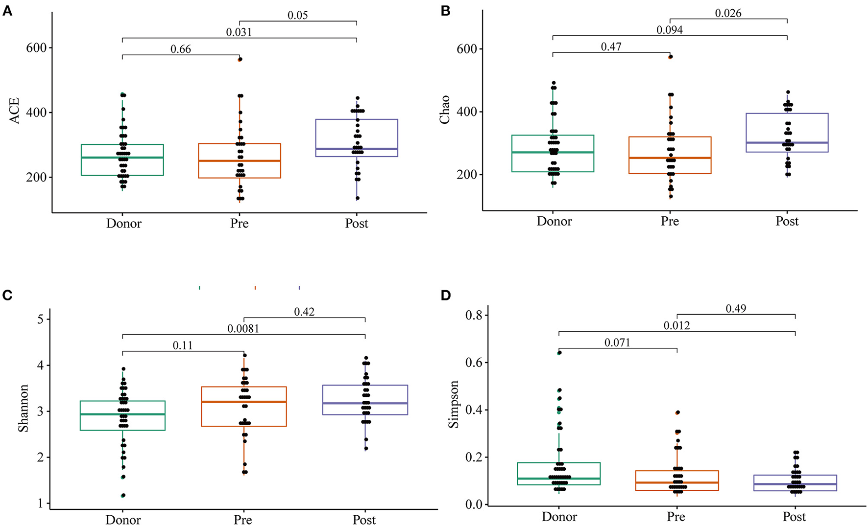 ACE (A), Chao (B), Shannon (C), and Simpson (D) were used to analyze the alpha diversity of the gut microbiomes of the donors, as well as patients before and after receiving an FMT combination therapy. Statistical analysis used Wilcoxon rank-sum test.