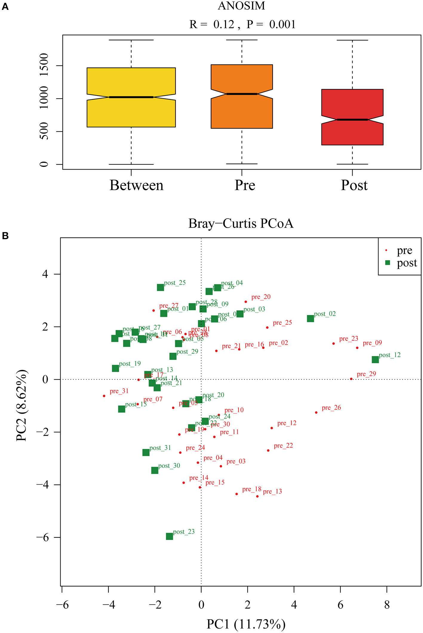(A) ANalysis Of Similarities was used to compare the differences in each group and between the two groups (pre- and post-FMT) in the microbiota structure. (B) Principal-component analysis of the fecal microbiota between pre- and post-FMT groups.