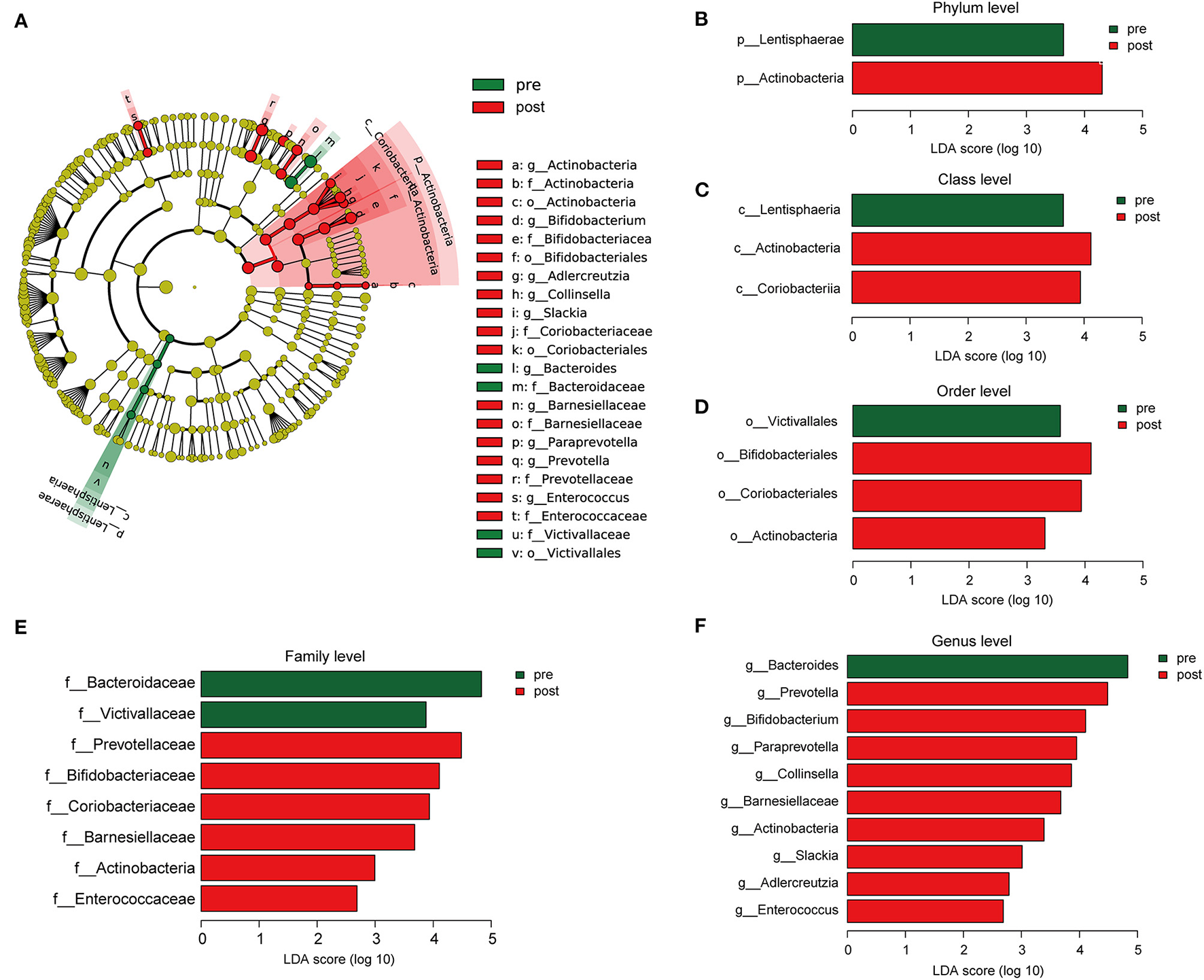 Cladograms were plotted by the LEfSe analysis, which presented the most significant difference at the taxonomic levels between pre- and post-FMT groups (Figure 5A). Figures 5B–F, respectively, showed the high- and low-dimensional biomarkers at phylum, class, order, family, and genus levels in the patients with post-FMT gut microbiota as compared with that of the patients with pre-FMT. At the phylum level, the abundance of Actinobacteria significantly increased, while Lentisphaerae decreased (Figure 5B). At the class level, Actinobacteria, Coriobacteriia increased, while Lentisphaeria decreased (Figure 5C). At the order level, Bifidobacteriales, Coriobacteriales, and Actinobacteria increased, while Victivallales decreased (Figure 5D). At the family level, Prevotellaceae, Bifidobacteriaceae, Coriobacteriaceae, Barnesiellaceae, Actinobacteria, and Enterococcaceae increased, while Bacteroidaceae, Victivallaceae decreased (Figure 5E). At the genus level, Prevotella, Bifidobacterium, Paraprevotella, Collinsella, Barnesiellaceae, Actinobacteria, Slackia, Adlercreutzia, and Enterococcus increased, while Bacteroides decreased (Figure 5F).