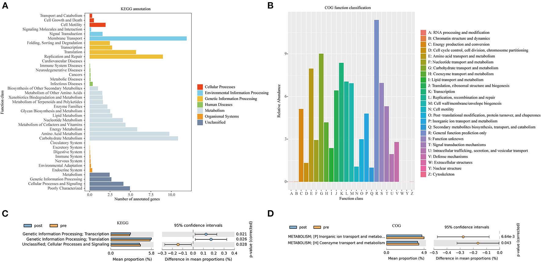 Figure 6A presents the Kyoto Encyclopedia of Genes and Genomes (KEGG) annotation (Figure 6B) and Clusters of Orthologous Genes (COG) function (Figure 6B) predicted by PICRUSt based on the sequencing data of microbiome from all the patients. KEGG pathway (Figure 6C) and COG function (Figure 6D) in the second-level classification comparisons were performed to explore potential differences in the functional composition of the microbiome between pre- and post-FMT patients by the STAMP software based on the results of PICRUSt. Genetic information processing (transcription and translation) of the gut microbiota was more active after receiving the FMT combination therapy (Figure 6C). Inorganic ion transport and metabolism, coenzyme transport, and metabolism in the gut microbiota of the patients with post-FMT were not as active as that in the patients with pre-FMT.