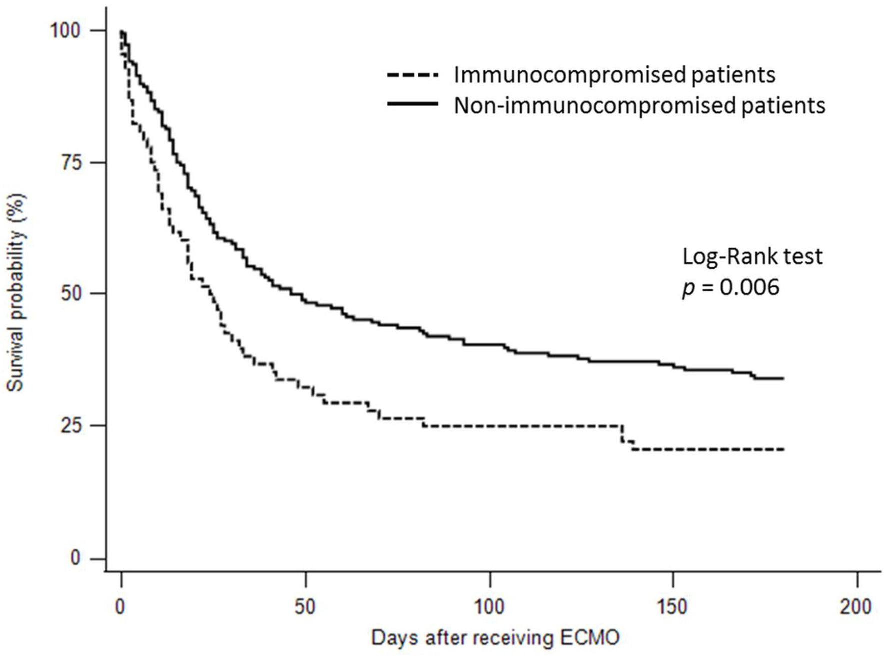 Kaplan-Meier survival curves for 6-month survival in the immunocompromised and immunocompetent patients with acute respiratory distress syndrome treated by extracorporeal membrane oxygenation.