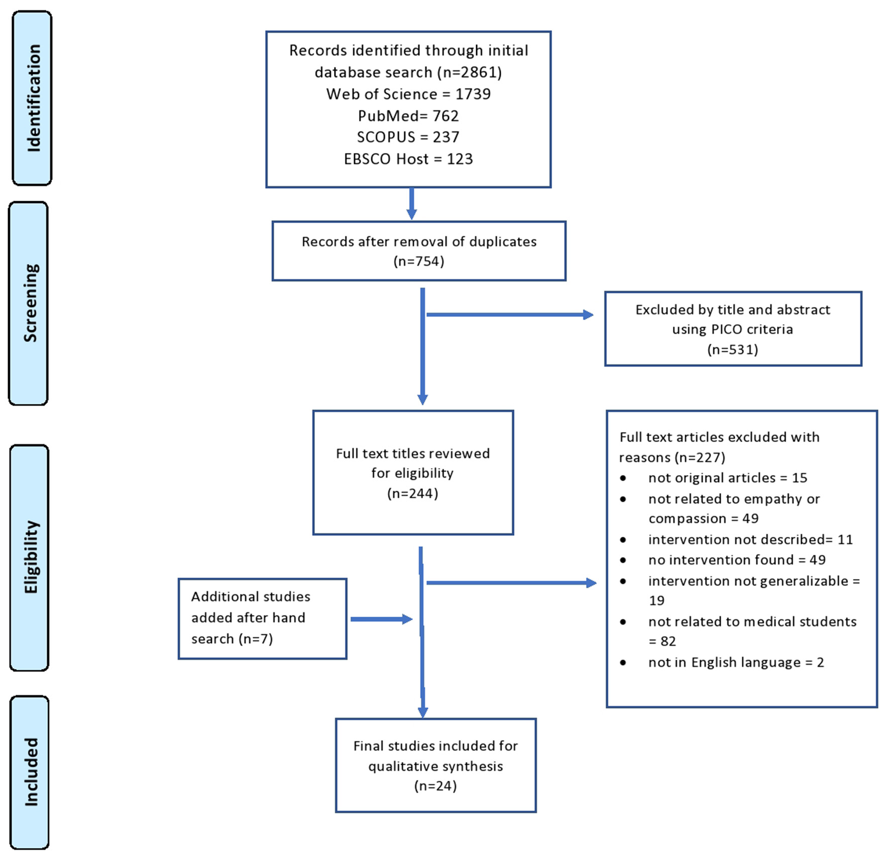 Methods: We searched the Web of Science, PubMed, Scopus, and EBSCO Host on 22nd July 2020. We adapted our search strategy from a previously published systematic review on education for compassion and empathy. Selected studies were required to have used unique educational interventions for promoting empathy and compassion of medical students. The research questions were based on Participants (medical students), Intervention (empathy and/or compassion related teaching), Comparison, and Outcome.