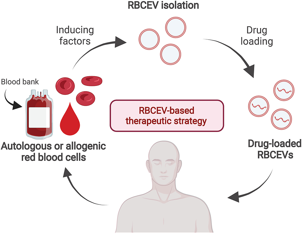 A proposed strategy of drug-loaded RBCEV therapy. RBCs can be collected from a single patient in order to produce autologous RBCEVs and administration back after drug loading to the same patient when required. Alternatively, RBCEVs can be produced in a large scale from the blood group-matched packed red cell units released from the blood bank for the allogenic RBCEV therapy.