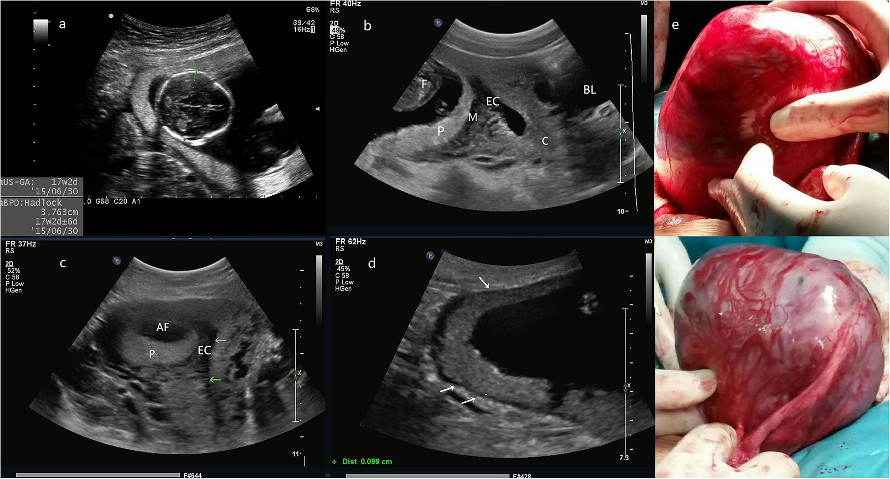 (a) the biparietal diameter of the fetus is 38 mm, the estimated gestational age is 17 weeks and 2 days. (b) The midsagittal section image reveals that the posterior myometrium is between GS and the EC. (c) The transversal section shows that the GS is located in the right posterior wall with a myometrial echo between GS and the EC (arrow). (d) The site of placental attachment covers the entire right posterior wall of the uterus, with a myometrial thickness of 0.9–1.2 mm (arrow). (e) The intraoperative image, an enlarged uterus with a thin wall mass (a size of 14 cm) protrudes at the right posterior wall of the fundus, the fetus, and fetal movement is also palpable. (f) Another photo during the surgery. The entire GS is within the myometrium and does not connect with the uterine cavity even after the removal of the fetus and the placenta (Patient 1, GS, gestational sac; F, fetus; P, placenta; M, myometrium; EC, endometrial cavity; AF, amniotic fluid; C, cervix; BL, bladder).
