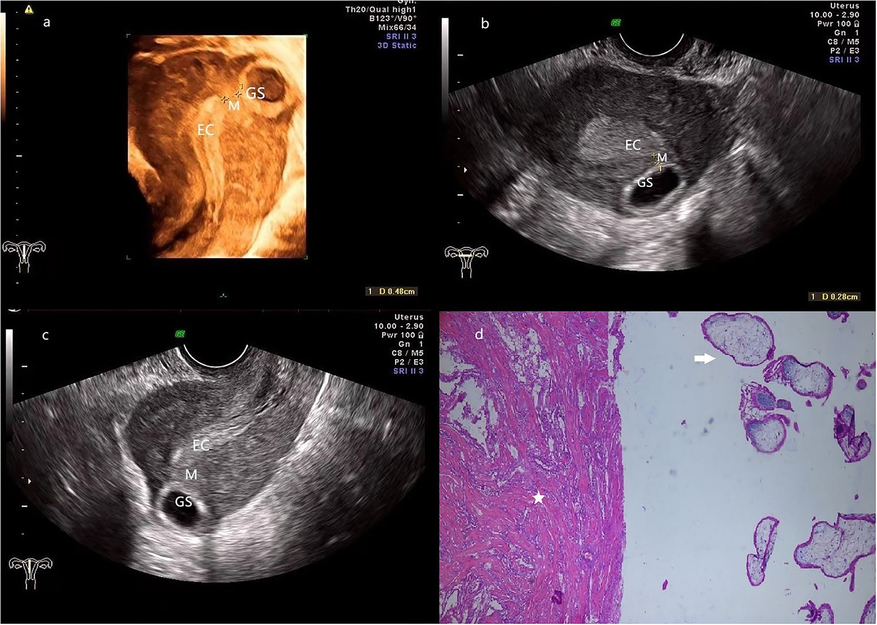 (a) 3-D ultrasonography reveals the relative location of EC, GS (a size of 2.7*1.0 cm), and the myometrium (0.5 cm in thickness) is located between them. (b,c) transversal (b) and sagittal (c) section image showed that the GS is located at the left posterior wall of the fundus, and the connection with EC is disrupted by the myometrium. (d) The pathologic examination demonstrates that muscular tissue (star) coexists with the chorionic villus (arrow). (Patient 2, GS, gestational sac; M, myometrium; EC, endometrial cavity).