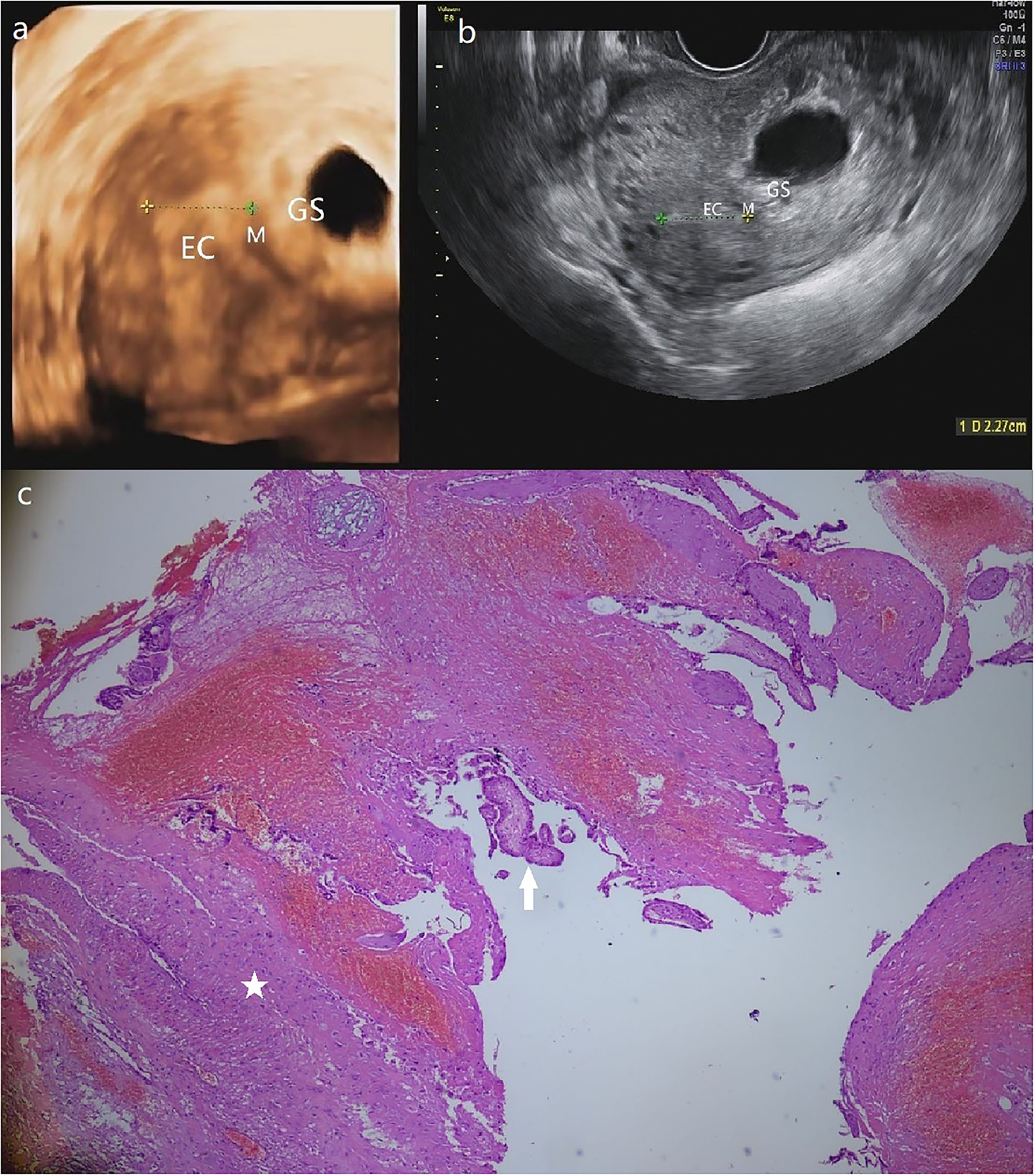 (a) The GS in a size of 4.9*3.4 cm is detected in a heterogeneous echo mass of 6.1*4.5 cm at the left posterior uterine wall near the left corner of the 3-D ultrasound. (b) Transversal section image in 2-D ultrasound demonstrates the intramural pregnancy and shows that the GS has no communication with EC. (c) The pathological result shows the myometrium (star) and the chorionic villus (arrow). (Patient 3, GS, gestational sac; M, myometrium; EC, endometrial cavity).