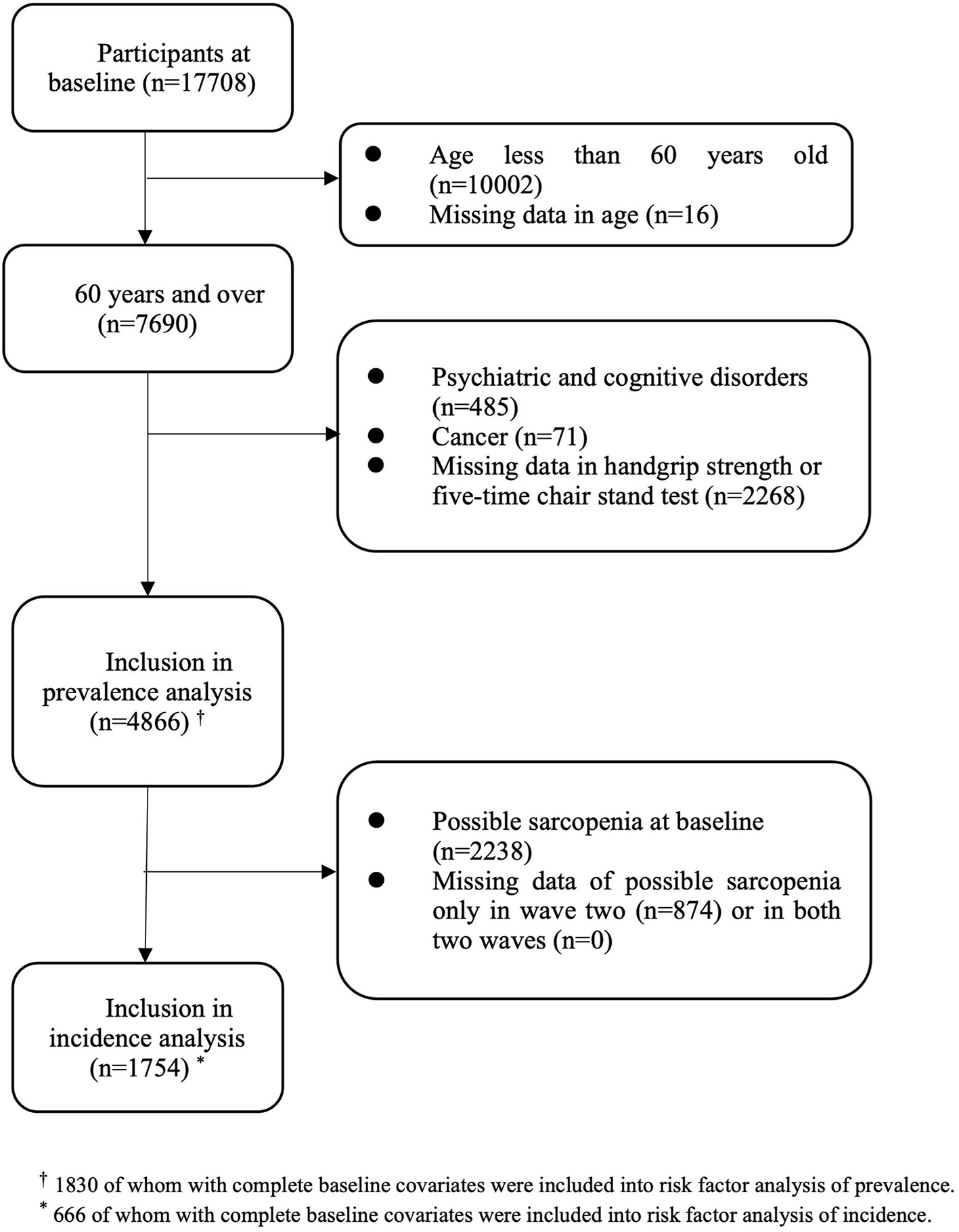 Descriptive statistics on the sample characteristics were calculated for the total analytical sample. For incidence assessment, we only analyzed the data from participants who were free of possible sarcopenia at baseline. Those who lacked data to identify possible sarcopenia at both two follow-up waves (2013 and 2015) were excluded. Furthermore, to restrict interval censoring to within 2 years, we also excluded those who only lacked data on possible sarcopenia at the second wave (2013). Incidence proportion was calculated as new cases during the follow-up divided by the total number of at-risk subjects being followed. The four-year incidence rate of possible sarcopenia was calculated as new cases during 2011–2015 divided by the person-years of follow-up.