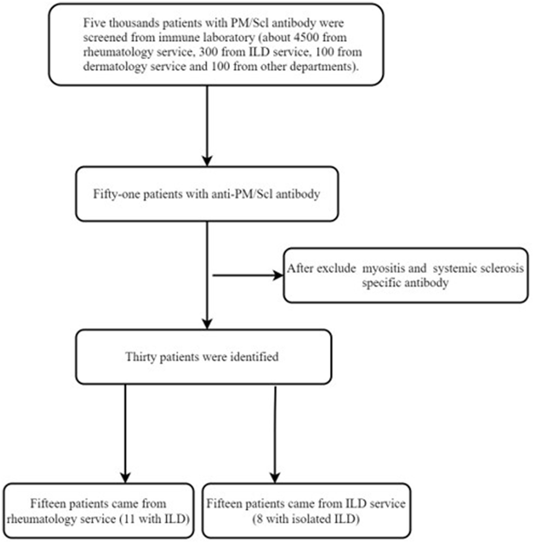 Anti-PM/Scl antibodies were screened from the immune laboratory, with a total of about 5,000 samples between May 2015 and Oct 2020, and about 300 serum samples were from the ILD service. The following data of patients with anti-PM/Scl antibodies were obtained from the medical records: age, gender, pulmonary function tests (PFTs), electrocardiogram, ultrasonic cardiogram, pulmonary high-resolution CT (HRCT), levels of creatine kinase (CK) and lactate dehydrogenase (LDH), C-reactive protein (CRP), erythrocyte sedimentation rate (ESR), ferritin, immunoglobulin, presence of myositis-associated antibodies, and other myositis-specific autoantibodies (MSAs). If anti-PM/Scl-positive patients were combined with other MSAs, they were excluded. Response to treatment was documented, including complete follow-up on all patients.