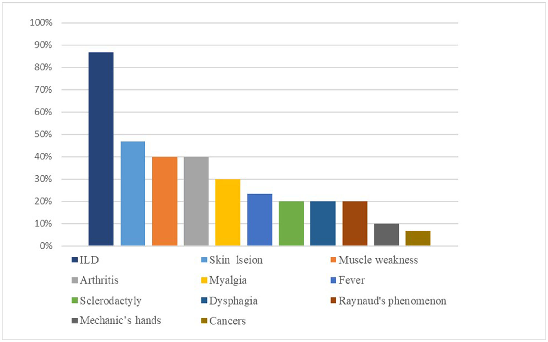 Muscle weakness and arthritis presented in 12 (40%) patients, and 9 (30%) suffered myalgia. In addition, 14 (46.7%) presented with the hallmark cutaneous manifestations of DM (Gottron's sign and heliotrope sign), sclerodactyly in 6 patients (20%), 3 (10%) demonstrated classic features of mechanic's hands, fever was present in 7 (23.3%), 6 (20%) suffered dysphagia, and Raynaud's phenomenon occurred in 6 (20%) patients. In addition, cancers were observed in two (6.7%) patients. Twenty-four (80%) patients were antinuclear antibodies-positive, and the titers ranged from 1:40 to 1:320 (nuclear or cytoplasmic speckled). Twelve (40%) patients tested positive for Ro-52 antibodies. The frequency of clinical features is listed in Figure 2.
