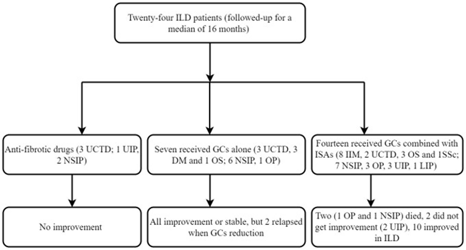 Fellow up of patients with ILD. GCs, glucocorticoids; OS, overlapping syndrome; ISA, immunosuppressive agents.