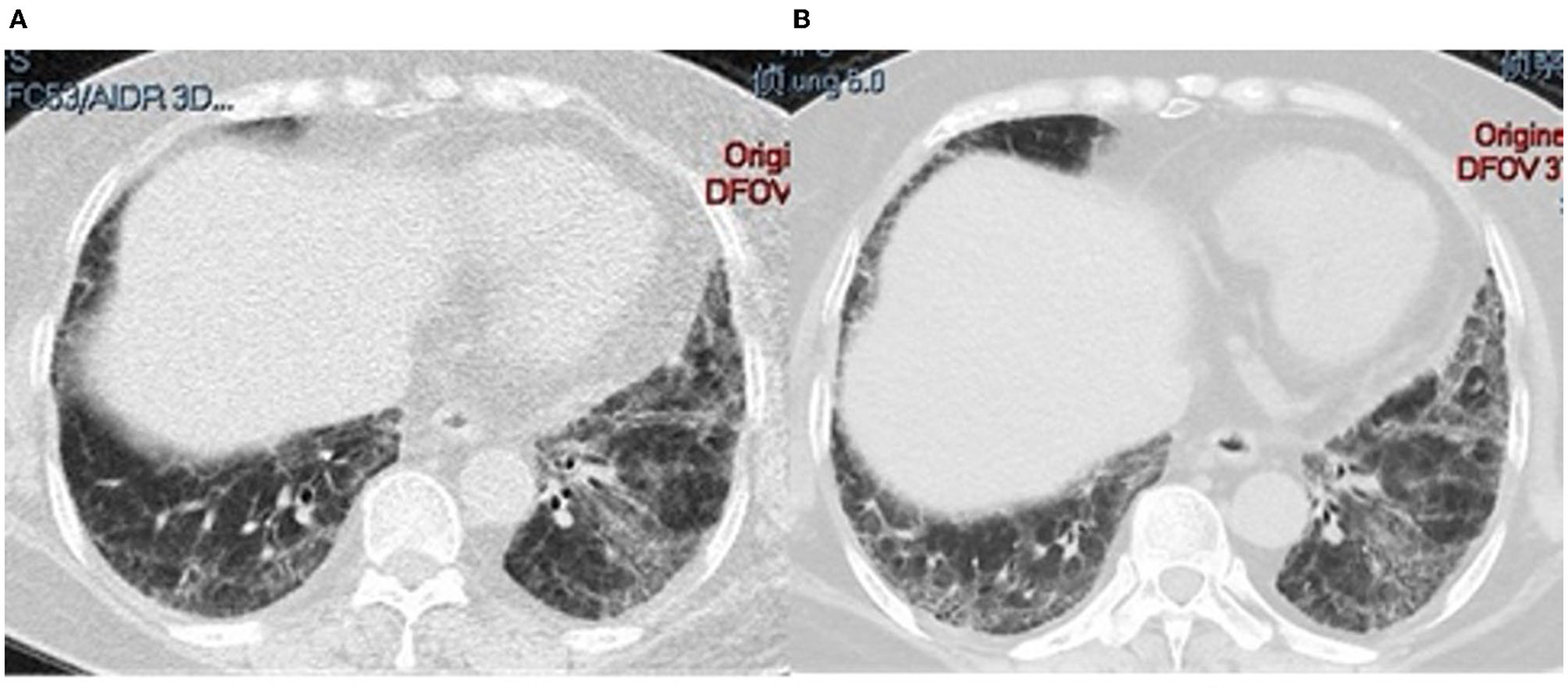 Lung CT changes in a 41-year-old man with PM/Scl-75 and−100. (A) CT at onset; (B) ILD progression after 8 months of treatment with an anti-fibrotic drug.