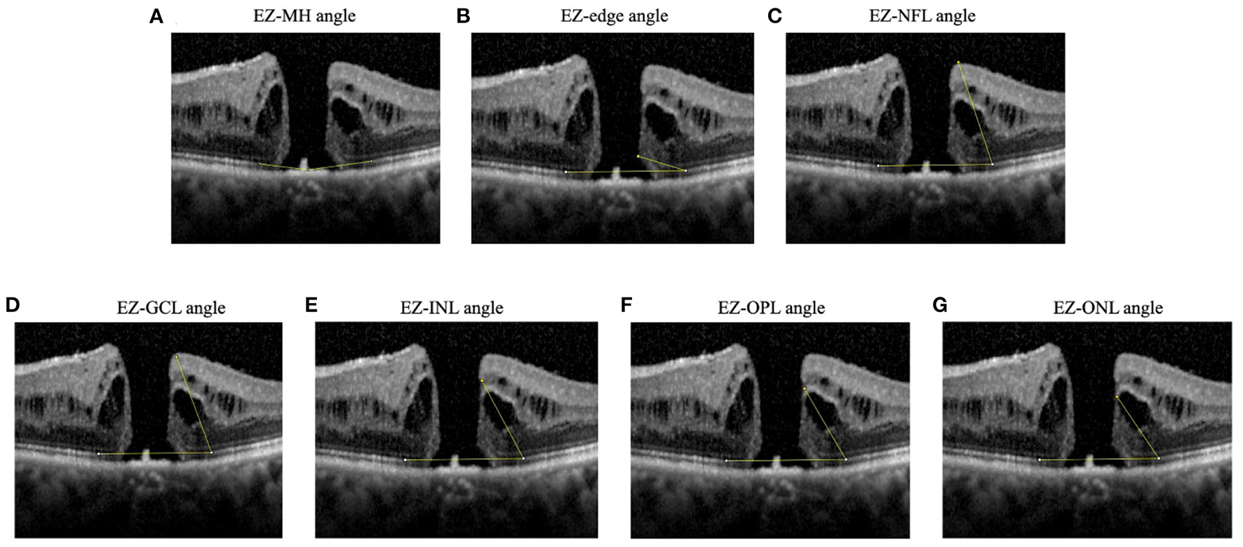 Diagrams showing angles measured. (A) EZ-MH angle: the angle whose vertex located at the center of the hole and the endpoints of both sides were located at the anterior border of the EZ band edge, (B) EZ-edge angle: the angle between a line connecting the upper edge of the EZ band and a line through the most protruding point of either edge of the MH, (C) EZ-NFL angle, (D) EZ-GCL angle, (E) EZ-INL angle, (F) EZ-OPL angle, (G) EZ-ONL angle. The EZ-NFL, EZ-GCL, EZ-INL, EZ-OPL, and EZ-ONL angles were each between a line connecting the two upper edges of the EZ band, and a line through the upper edge of the respective band. If measurements were different between left and right hole edge, the smaller angle was recorded. EZ, ellipsoid zone; GCL, ganglion cell layer; INL, inner nuclear layer; NFL, nerve fiber layer; ONL, outer nuclear layer; OPL, outer plexiform layer.
