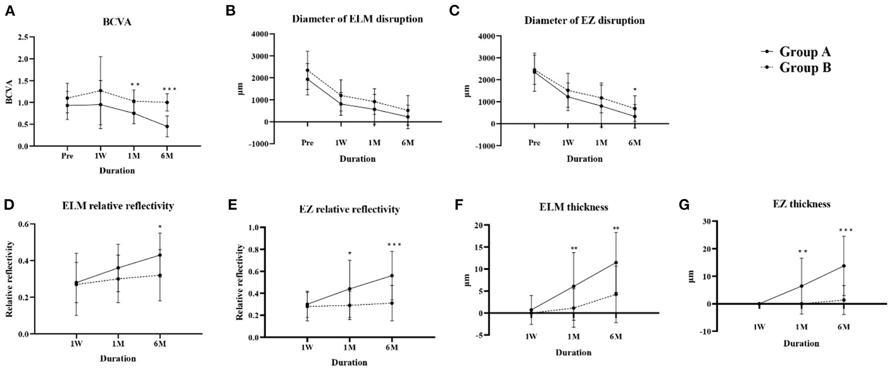 Changes in parameters over time in groups A and B. (A) BCVA, (B) diameter of ELM disruption, (C) diameter of EZ disruption, (D) ELM relative reflectivity, (E) EZ relative reflectivity, (F) ELM thickness, (G) EZ thickness. BCVA, best-corrected visual acuity; ELM, external limiting membrane; EZ, ellipsoid zone. *P < 0.05; **P < 0.01; ***P < 0.001.