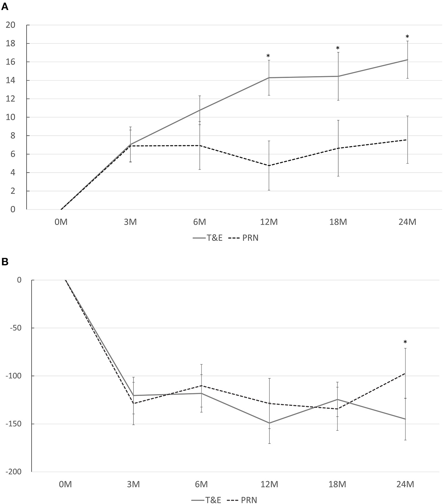 (A) Mean changes in the best-corrected visual acuity from baseline at different time points. A significant difference between the T&E and PRN groups is found at 12, 18, and 24 months. (B) Mean changes in the central foveal thickness from baseline at different time points. A significant difference between the T&E and PRN groups is found at 24 months. T&E, treat-and-extend; PRN, pro re nata. *p < 0.05.