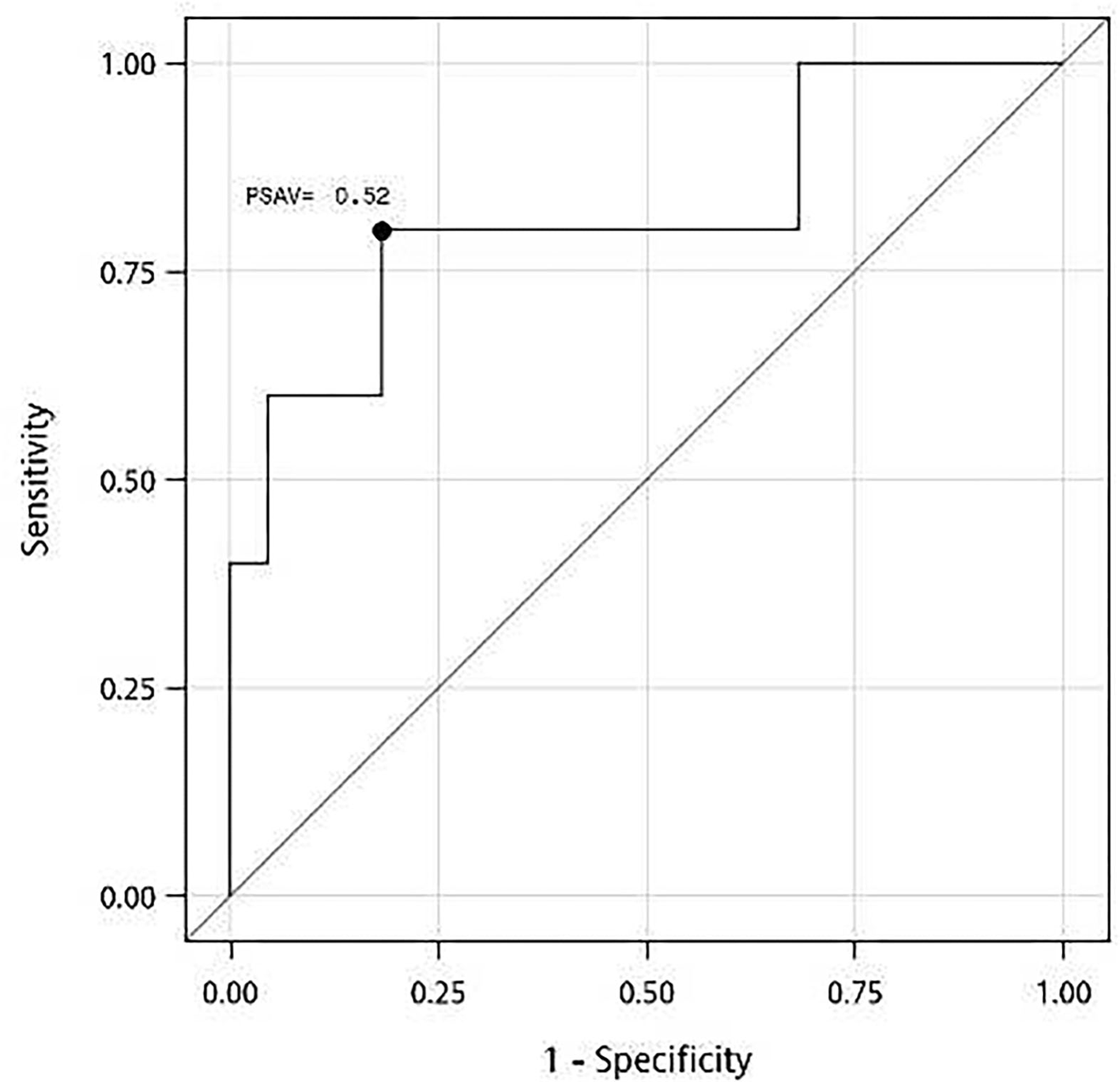 A receiver operating characteristic (ROC) curve for prostate-specific antigen velocity (PSAV) at 3 months after thulium laser enucleation of the prostate (ThuLEP) for predicting the best cutoff point for surgery effectiveness at 15 months postsurgery. Area under curve (AUC) = 0.82, with P < 0.02. Youden index: PSAV = −0.52 ng/ml, with sensitivity of 0.80 and specificity of 0.82.