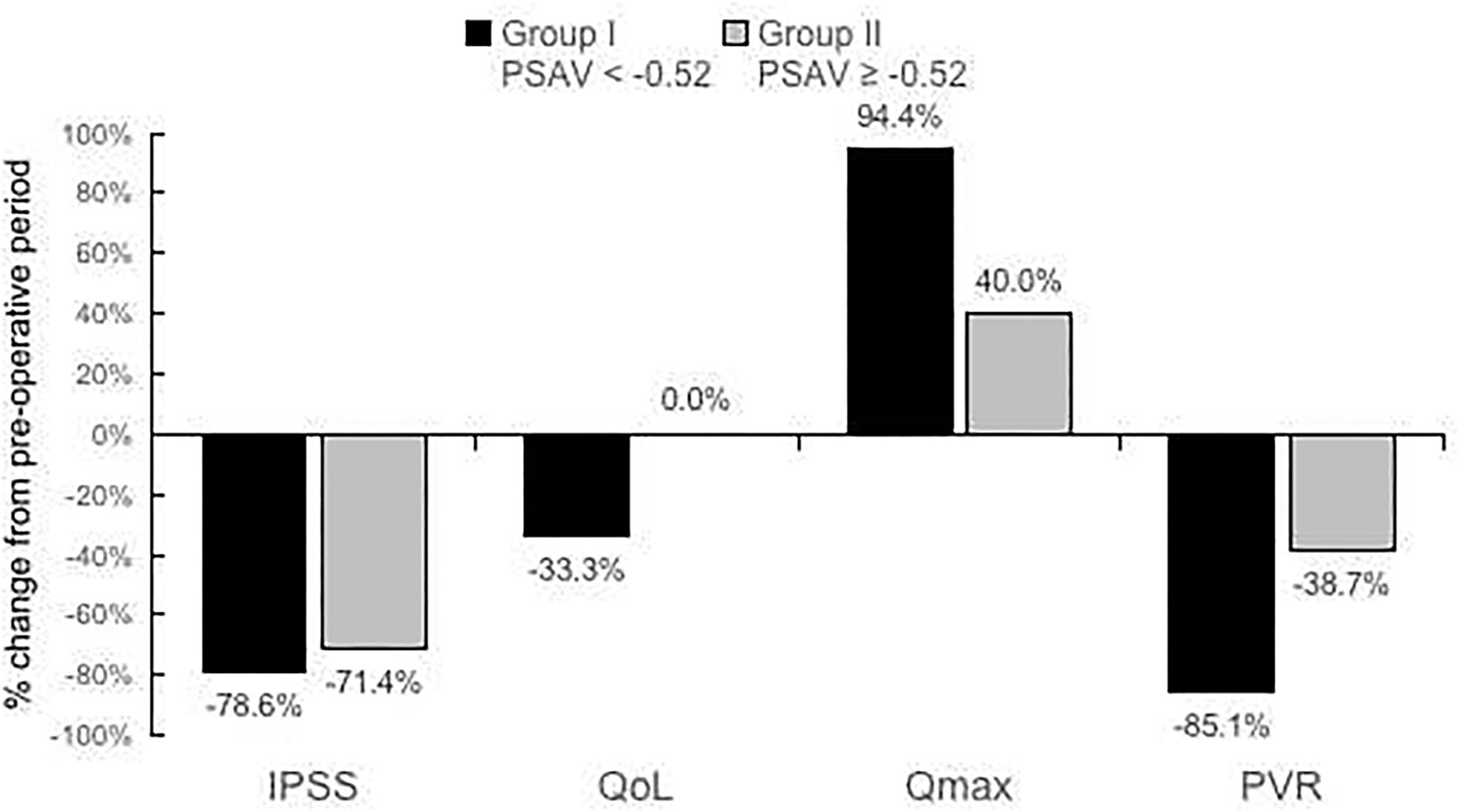 Percentage reduction of International Prostate Symptom Score (IPSS), quality of life (QoL), maximum flow rate (Qmax), and postvoid residual (PVR) at 15 months postsurgery compared with those at presurgery for PSAV < −0.52 or PSAV ≥ −0.52 ng/ml (PSAV obtained at 3 months postsurgery).