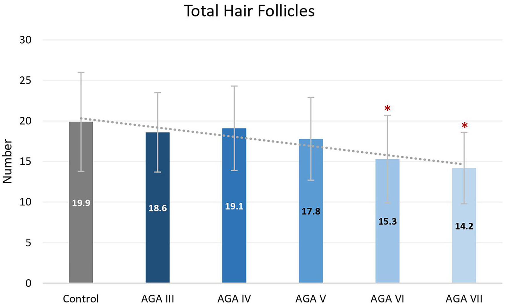 Total hair follicles between controls and patient subgroups with different disease severity of androgenetic alopecia (AGA). *P < 0.05 when compared to the control group.