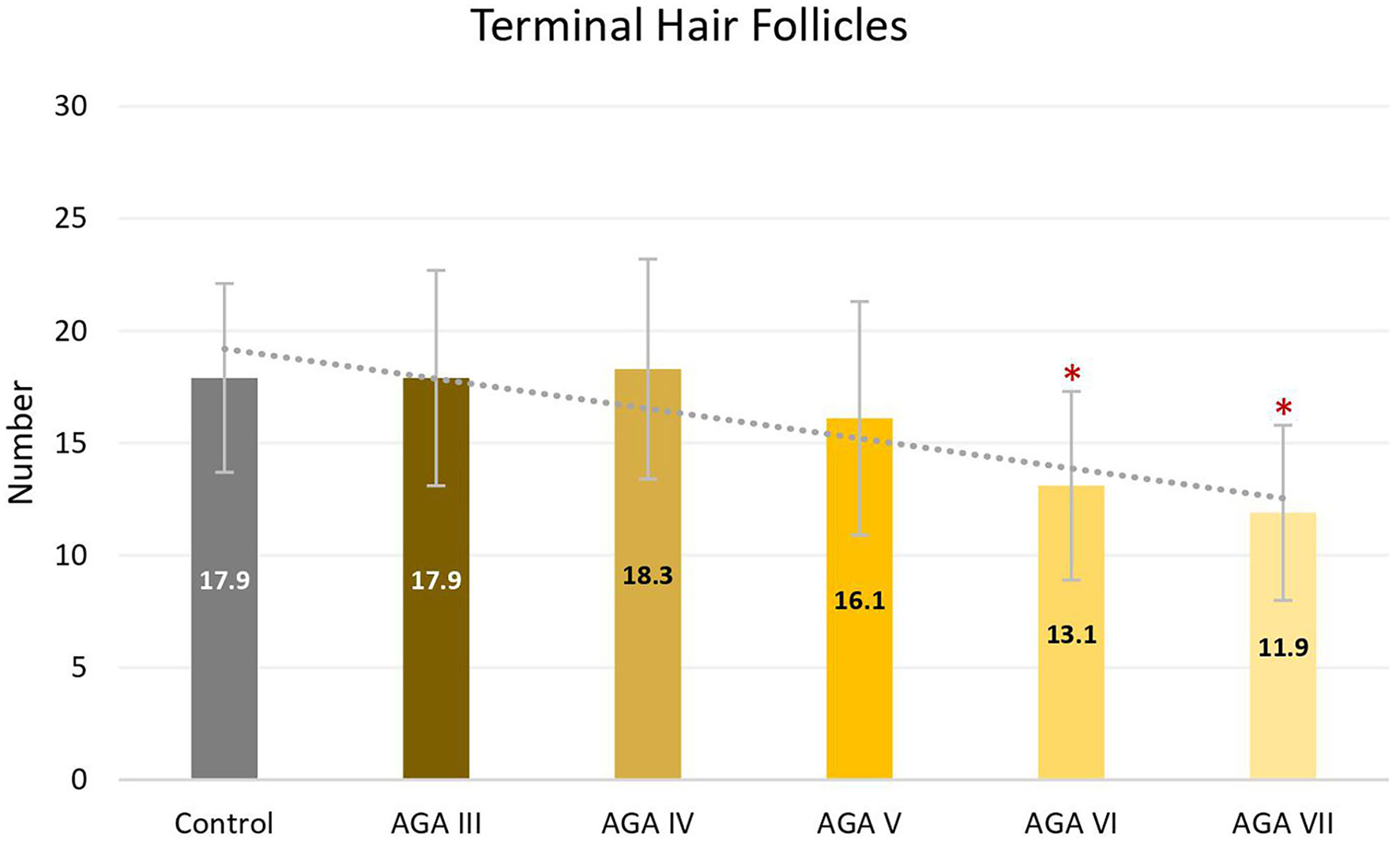 Terminal hair follicles between controls and patient subgroups with different disease severity of androgenetic alopecia (AGA). *P < 0.05 when compared to the control group.