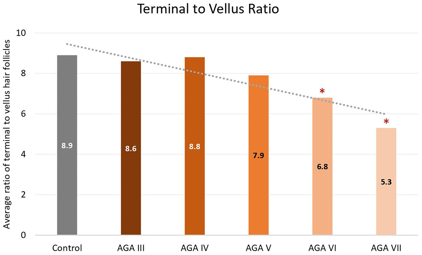Terminal to vellus hair ratio between controls and patient subgroups with different disease severity of androgenetic alopecia (AGA). *P < 0.05 when compared to the control group.