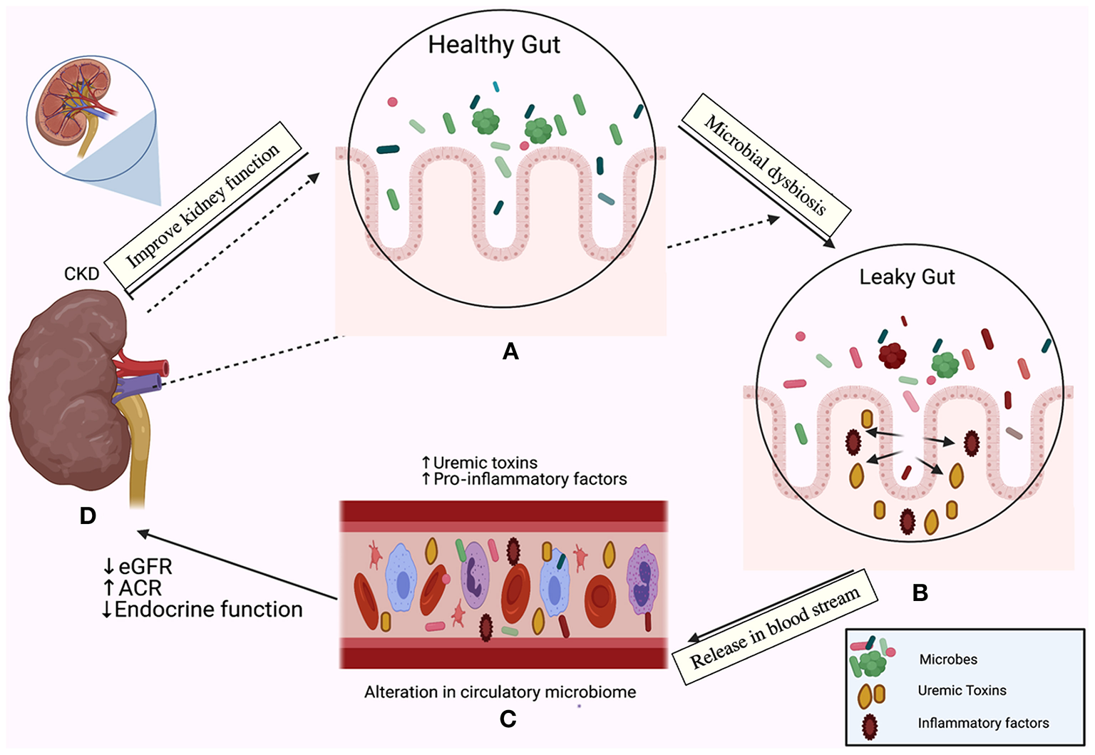 The relationship between the gut microbiome and chronic kidney disease (CKD) is bi-directional. In one direction, the gut microbiota affect the kidney; the emerging role of gut microbiota in (A) The healthy gut, (B) The leaky gut due to microbial dysbiosis and disruption of the mucosal layer, (C) Release of pro-inflammatory factors in the bloodstream and initiation of the inflammatory cascade, accumulation of uremic toxins, (D) A decline in the estimated glomerular filtration rate (eGFR), the elevation of the albumin creatinine ratio (ACR) and loss of the endocrine functions of the kidney. In the other direction, CKD drives dysbiosis in the gut (indicated by the dotted arrows) and initiates an inflammatory cascade.