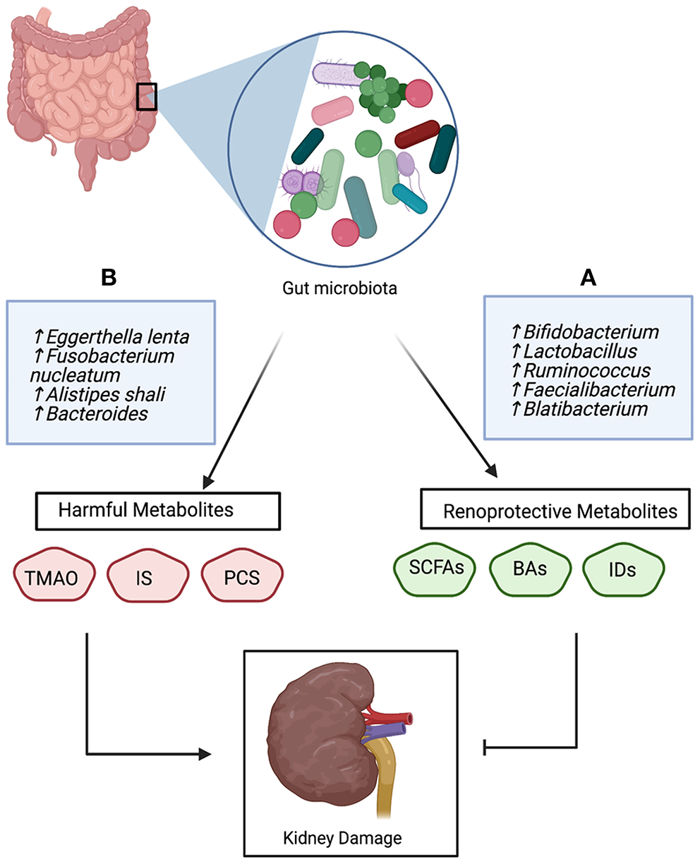 The major part of the human microbiome is centralized in the gut (22). The gut microbiota harbors 10-fold more microbial cells than human cells, which regulates nutrient metabolism and produces various metabolites that affect the kidney, heart, vascular system, and liver (23). There is a bi-directional relationship between dysbiosis and the pathogenesis of CKD (20, 24–26). We summarized this relationship in Figure 1. It is well-established that an increase in levels of harmful metabolites including trimethylamine N-oxide (TAMO), indoxyl sulfate, and p-cresyl sulfate are associated with renal fibrosis, endothelial dysfunction, a decline in the estimated glomerular filtration rate (eGFR), cardiovascular complications, and increased mortality and morbidity in CKD (27–30). Moreover, the serum levels of 5-methoxytryptophan and indoxyl sulfate correlate positively with CKD progression (31). On the other hand, renoprotective metabolites including short-chain fatty acids prevent the progression of CKD by suppressing the disruption of the epithelial barrier and regulating the anti-inflammatory response (25, 32). The level of indole propionic acid, derived from the gut flora, negatively correlates with p-cresyl sulfate and indoxyl sulfate concentrations in CKD patients (33).