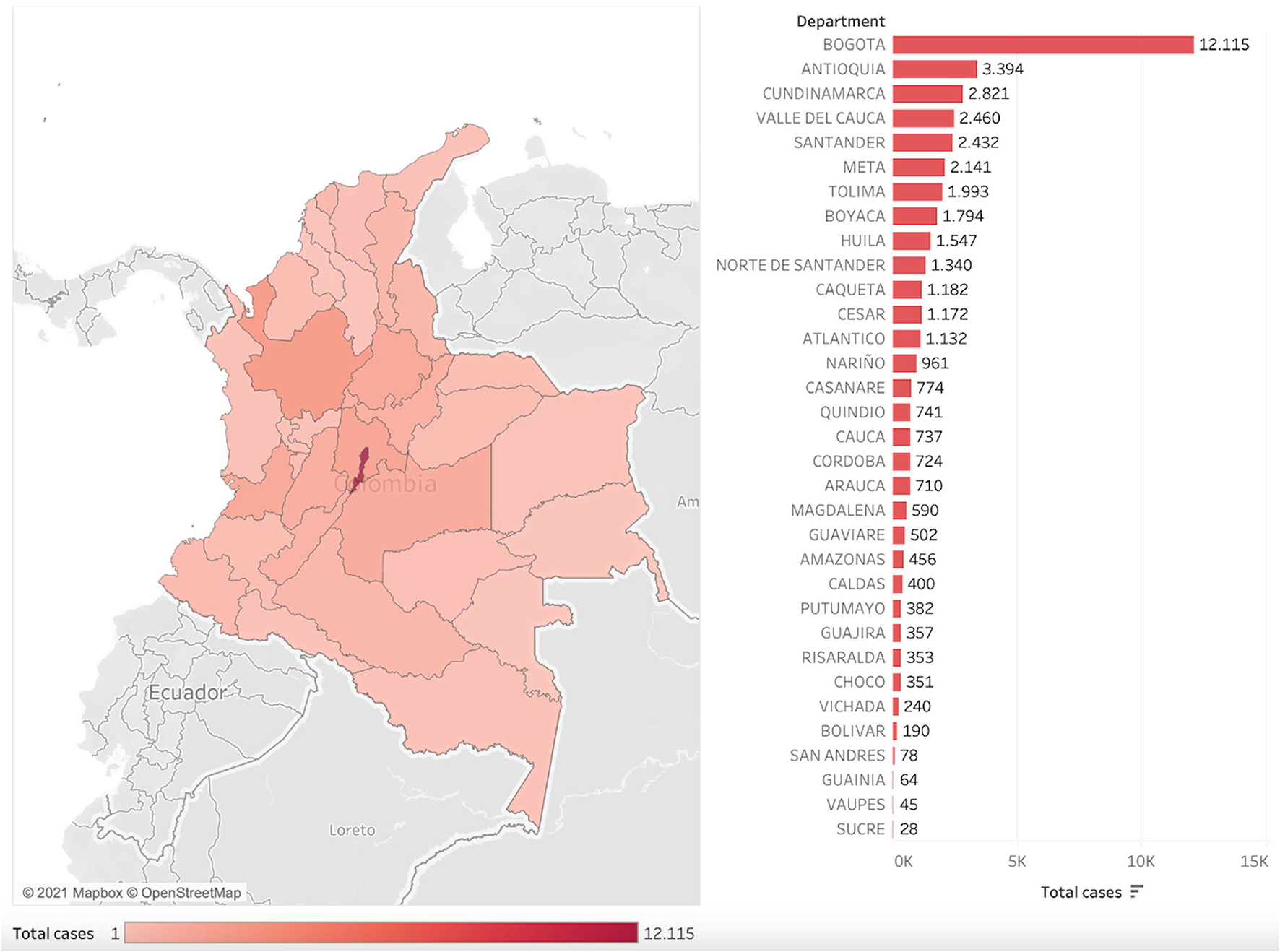 All graphical representations were performed in Tableau software v. 2021.3 (10), while mapping of the geographic distribution of COVID-19 cases was done in Mapbox © OpenStreetMap contributors, licensed under the Open Data Commons Open Database License (ODbL) by the Open Street Map Foundation (OSMF) using a Colombian departments layer.