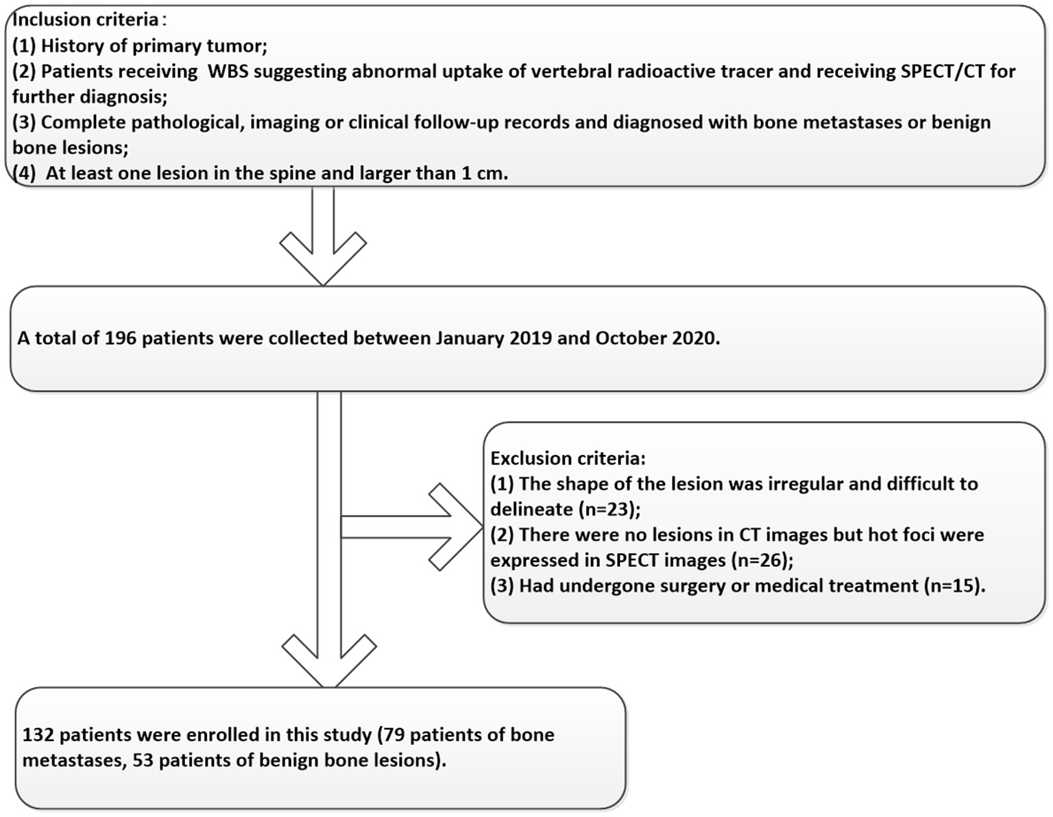 Participants between January 2019 and October 2020 were enrolled in this study according to the following inclusion criteria: 1) Patients a had history of the primary tumor; 2) Patients received SPECT/CT for further diagnosis because of abnormal uptake of vertebral radioactive tracer in 99mTc-MDP WBS; 3) Complete pathological, imaging, or clinical follow-up records and diagnosed with bone metastases or benign bone lesions; 4) At least one lesion in the spine and larger than 1 cm. In addition, the exclusion criteria included the following: 1) The shape of the lesion was irregular and difficult to delineate; 2) Abnormal uptake of radioactive tracer in SPECT images without lesions in CT images; 3) Had undergone surgery or medical treatment. The enrolled patients were randomly divided into the training and validation groups at the ratio of 7:3. The details of the participant's selection process were shown in Figure 1. This retrospective study was approved by the hospital ethics review committee and the requirement for informed patient consent was waived.