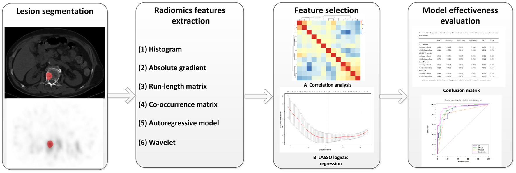 Radiomics convert digital images into mineable data through automated or semi-automatic and high-throughput methods. Radiomics could analyze the heterogeneity of tumors as a whole through hundreds of quantitative features and also analyze the quantitative relationship between tumor biological features and imaging features, which could construct models for tumor diagnosis, efficacy evaluation and prediction, and provide valuable references for clinical treatment of tumors (12, 13). The current research on radiomics mainly focused on CT and MRI (14–16). The pathological mechanism of bone metastasis was based on the disruption of the metabolic balance between osteoclasts and osteoblasts by the molecular action of cancer cells. In contrast, the benign bone disease showed inflammation and tissue remodeling of the periosteal cartilage tissue. Different osteoblastic and osteolytic mechanisms had the potential to cause different heterogeneity and distribution of radioactive tracer (17, 18). Furthermore, different from the anatomical information of the lesion provided by traditional imaging, SPECT/CT radiomics combined the anatomical information and metabolic information of the lesion to quantify the tumor heterogeneity, which had the potential to improve the diagnostic performance.