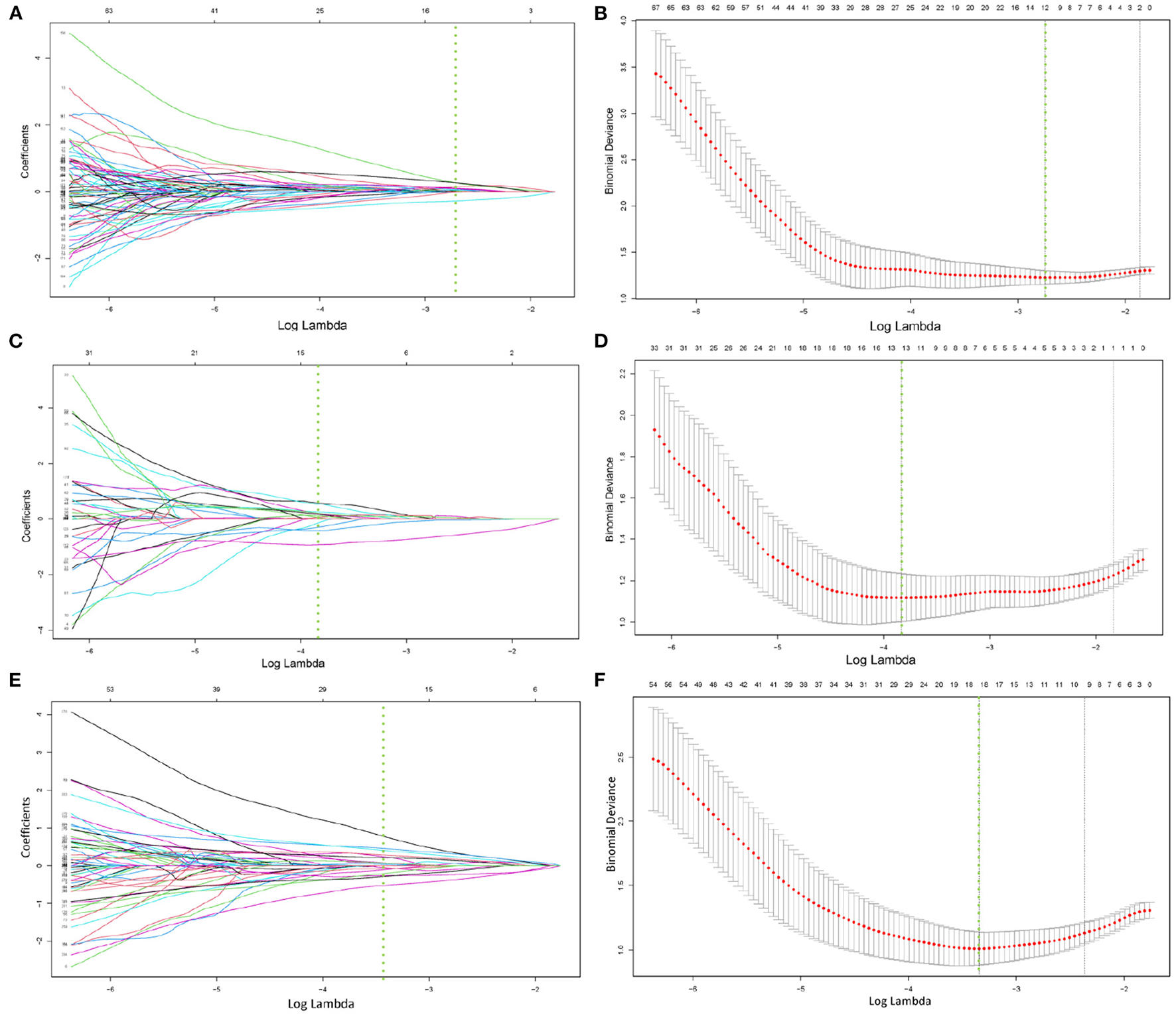 (A–F) demonstrated the specific process of least absolute shrinkage and selection operator (LASSO) regression analysis screening features for CT model, SPECT model, and ComModel, respectively. (A,C,E) showed the process of features selection. The vertical line was plotted at the optimal λ of 0.064, 0.025, and 0.035 for CT, SPECT, and ComModel, respectively. Twelve, thirteen, and eighteen factors with non-zero coefficients were finally selected for CT, SPECT, and ComModel, respectively. (B,D,F) showed that features selection was performed by 10-fold cross-validation with the criterion of minimum deviance.