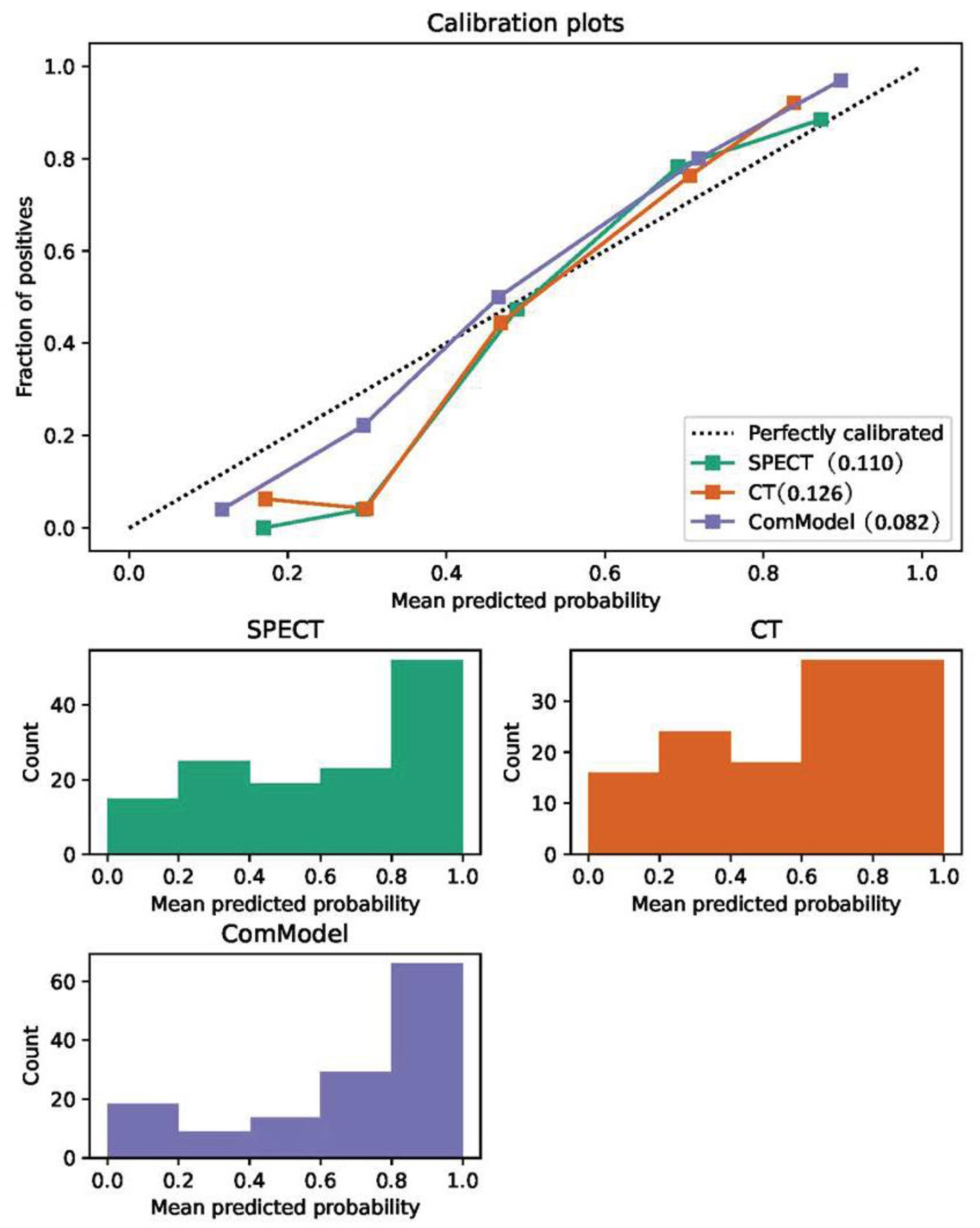 Comparison of the calibration curve and Brier score of different models. All three model's calibration curves were closed to ideal curves, indicating that the models had good fitness and predictive ability. The following figure shows the distribution of the probability of diagnosis for different models.
