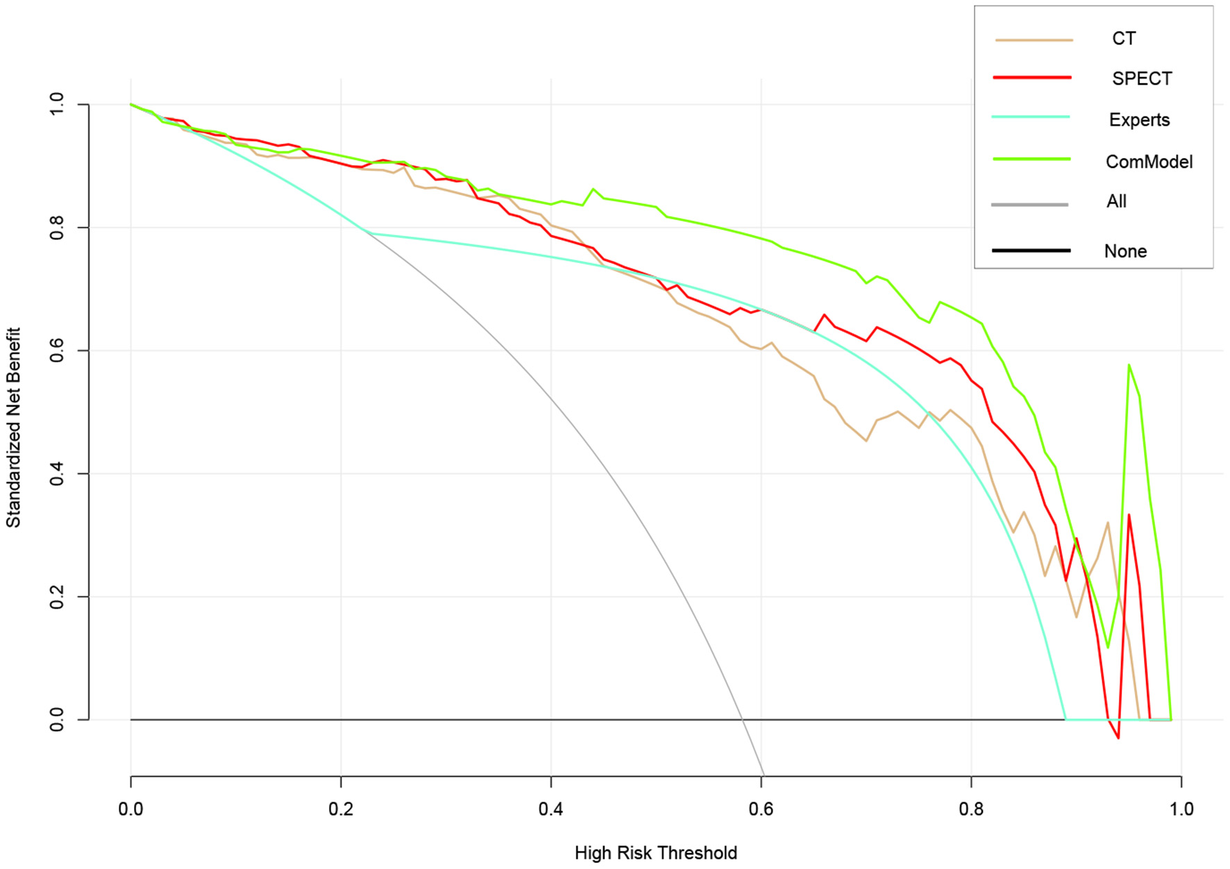Comparison of decision curve analysis (DCA) of different models. When the threshold was 0–1, the ComModel always had a better overall net clinical gain than the other models, the SPECT model also had higher clinical gain than the human experts, and there was no significant difference between the CT model and the human experts.