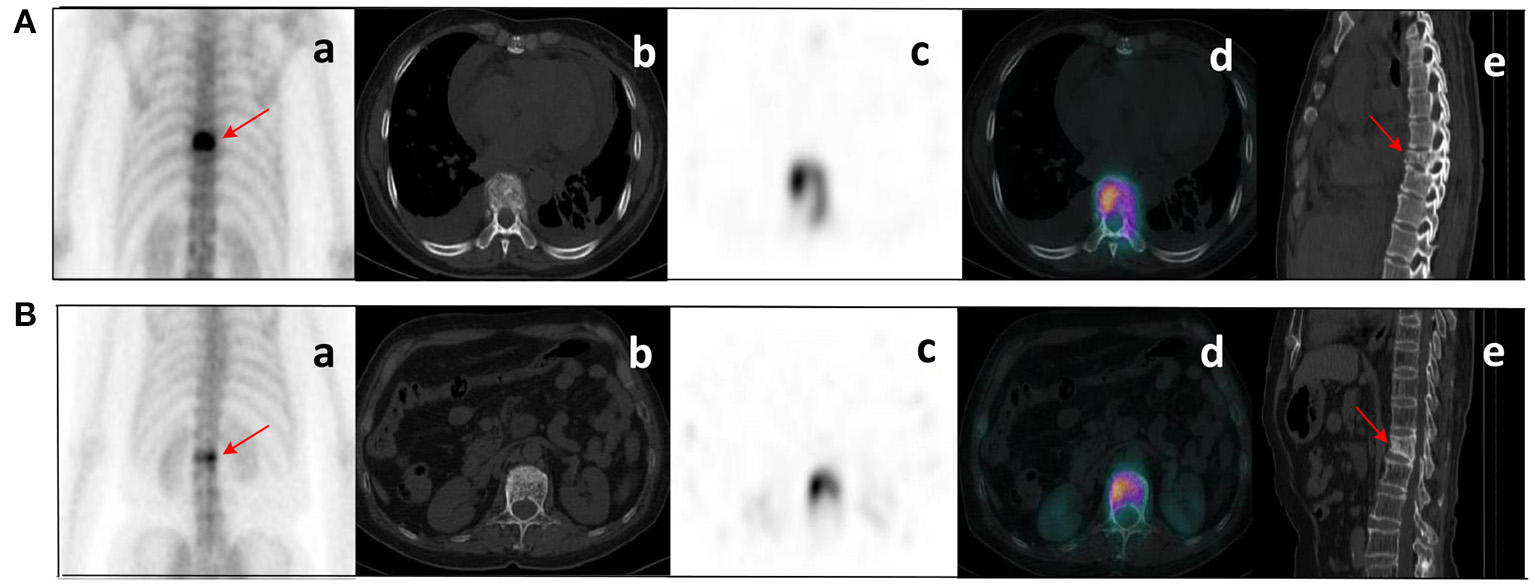 Clinical cases SPECT/CT images of bone metastases (A) and benign bone lesions (B). The images shown are WBS image, axial CT, SPECT, fusion image, and sagittal CT (a–e, respectively). (A) bone metastases: a 53-year-old female with an adenocarcinoma of the left lung. Wedge-like changes of the T8 vertebral body with an abnormal concentration of radioactive tracer (arrows). (B) benign bone lesions: a 68-year-old female with breast cancer. Wedge-like changes of the L1 vertebral body with higher bone density and increased radioactive tracer distribution (arrows). It was difficult to determine whether lesions were metastasis with conventional images only. Lesion (A) was confirmed as pathological fracture due to bone metastases by pathological examination and showed systemic bone metastases at subsequent imaging follow-up. Lesion (B) was confirmed to be a benign compression fracture by imaging follow-up and clinical information.